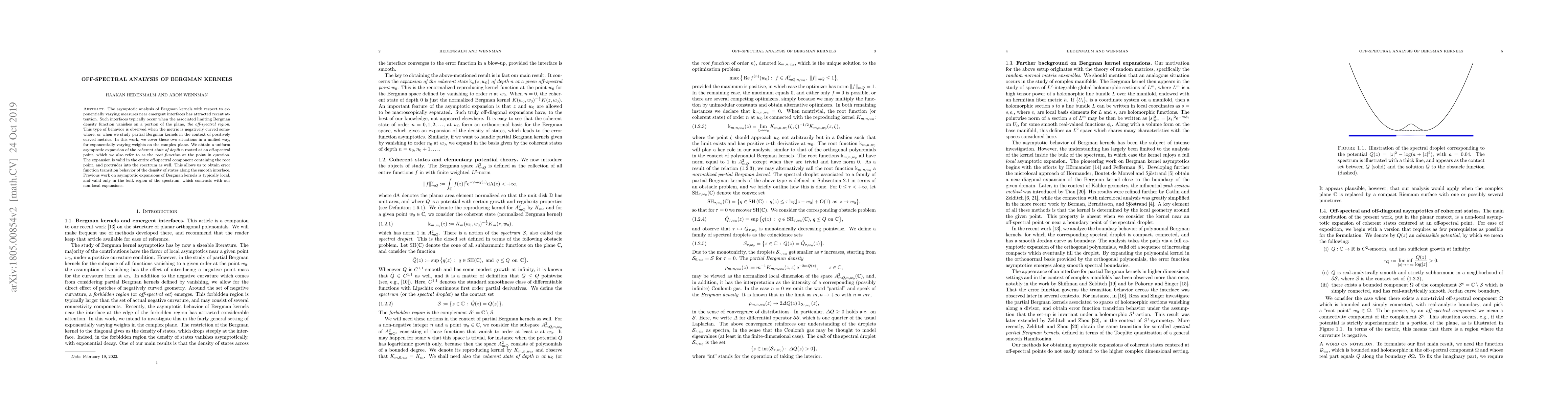 The asymptotic analysis of Bergman kernels with respect to exponentially varying measures near emergent interfaces has attracted recent attention. Such interfaces typically occur when the associated limiting Bergman density function vanishes on a portion of the plane, the off-spectral region. This type of behaviour is observed when the metric is negatively curved somewhere, or when we study partial Bergman kernels in the context of positively curved metrics. In this work, we cover these two situations in a unified way, for exponentially varying planar measures on the complex plane. We obtain uniform asymptotic expansions of root functions, which are essentially normalized partial Bergman kernels at an off-spectral point, valid in the entire off-spectral component and protruding into the spectrum as well, which allows us to show error function transition behaviour of the original kernel along the interface. In contrast, previous work on asymptotic expansions of Bergman kernels is typically local, and valid only in the bulk region of the spectrum.