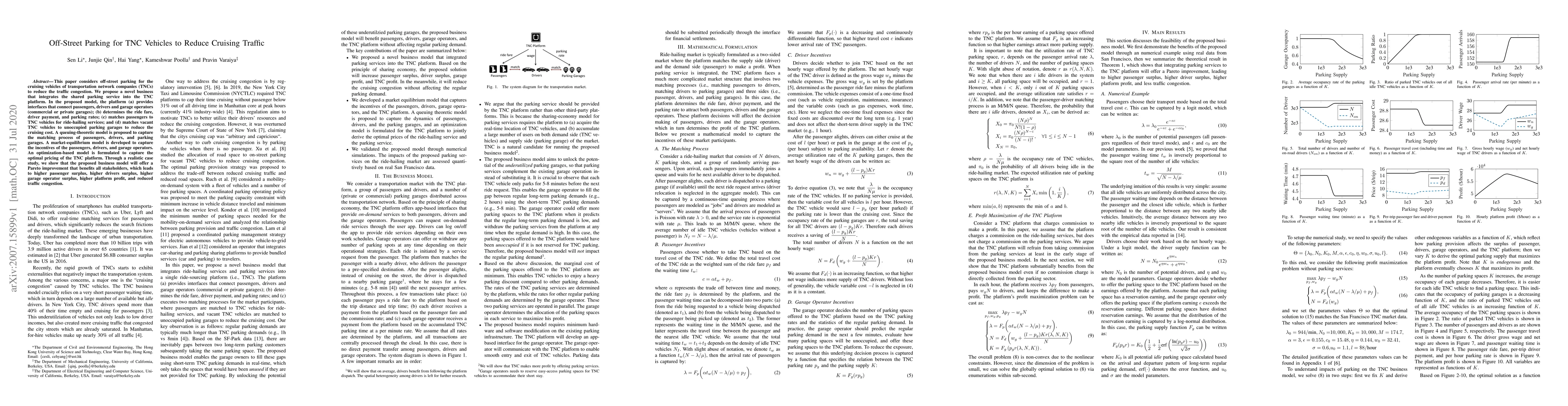 This paper considers off-street parking for the cruising vehicles of transportation network companies (TNCs) to reduce the traffic congestion. We propose a novel business that integrates the shared parking service into the TNC platform. In the proposed model, the platform (a) provides interfaces that connect passengers, drivers and garage operators (commercial or private garages); (b) determines the ride fare, driver payment, and parking rates; (c) matches passengers to TNC vehicles for ride-hailing services; and (d) matches vacant TNC vehicles to unoccupied parking garages to reduce the cruising cost. A queuing-theoretic model is proposed to capture the matching process of passengers, drivers, and parking garages. A market-equilibrium model is developed to capture the incentives of the passengers, drivers, and garage operators. An optimization-based model is formulated to capture the optimal pricing of the TNC platform. Through a realistic case study, we show that the proposed business model will offer a Pareto improvement that benefits all stakeholders, which leads to higher passenger surplus, higher drivers surplus, higher garage operator surplus, higher platform profit, and reduced traffic congestion.