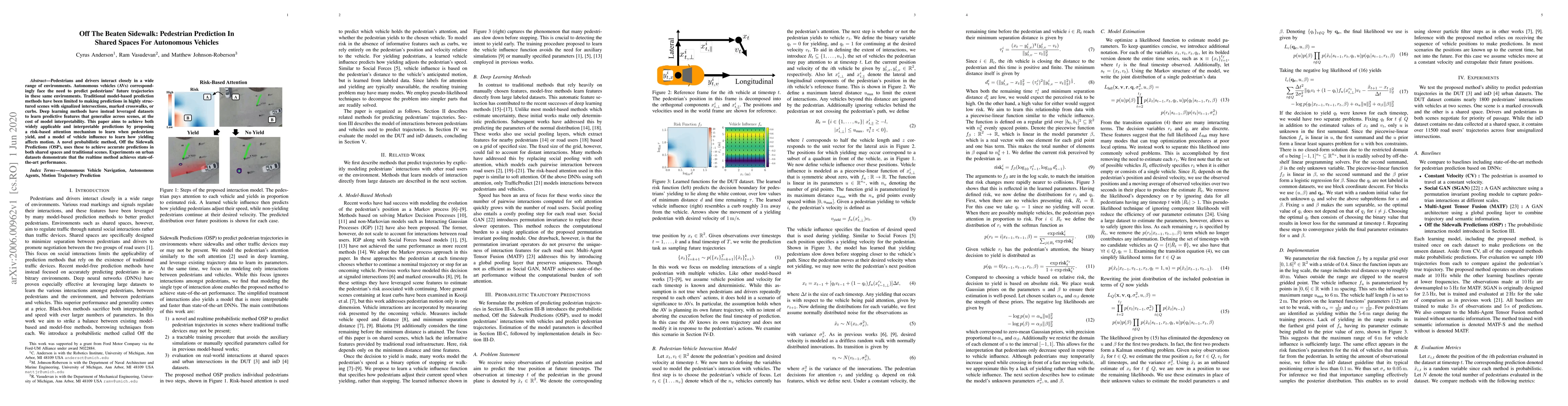 Pedestrians and drivers interact closely in a wide range of environments. Autonomous vehicles (AVs) correspondingly face the need to predict pedestrians' future trajectories in these same environments. Traditional model-based prediction methods have been limited to making predictions in highly structured scenes with signalized intersections, marked crosswalks, or curbs. Deep learning methods have instead leveraged datasets to learn predictive features that generalize across scenes, at the cost of model interpretability. This paper aims to achieve both widely applicable and interpretable predictions by proposing a risk-based attention mechanism to learn when pedestrians yield, and a model of vehicle influence to learn how yielding affects motion. A novel probabilistic method, Off the Sidewalk Predictions (OSP), uses these to achieve accurate predictions in both shared spaces and traditional scenes. Experiments on urban datasets demonstrate that the realtime method achieves state-of-the-art performance.