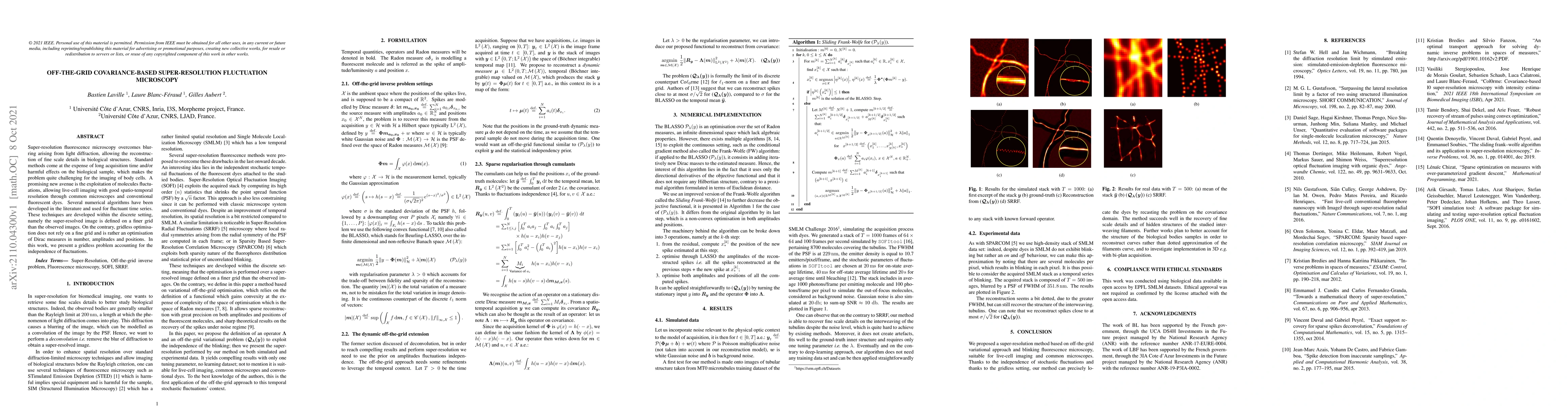 Super-resolution fluorescence microscopy overcomes blurring arising from light diffraction, allowing the reconstruction of fine scale details in biological structures. Standard methods come at the expense of long acquisition time and/or harmful effects on the biological sample, which makes the problem quite challenging for the imaging of body cells. A promising new avenue is the exploitation of molecules fluctuations, allowing live-cell imaging with good spatio-temporal resolution through common microscopes and conventional fluorescent dyes. Several numerical algorithms have been developed in the literature and used for fluctuant time series. These techniques are developed within the discrete setting, namely the super-resolved image is defined on a finer grid than the observed images. On the contrary, gridless optimisation does not rely on a fine grid and is rather an optimisation of Dirac measures in number, amplitudes and positions. In this work, we present an off-the-grid problem accounting for the independence of fluctuations.