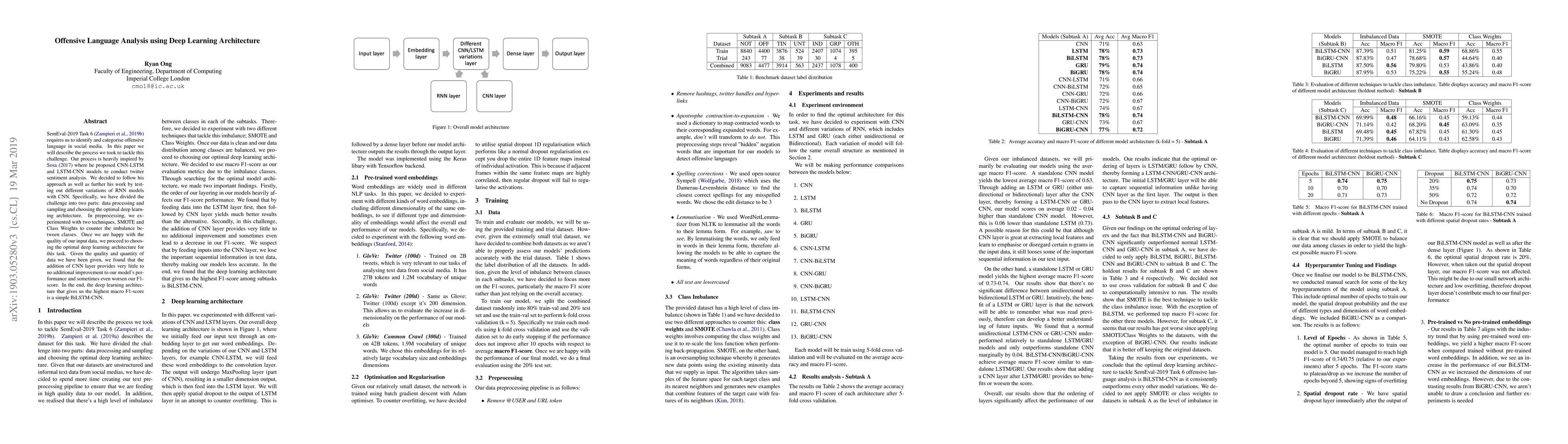 SemEval-2019 Task 6 (Zampieri et al., 2019b) requires us to identify and categorise offensive language in social media. In this paper we will describe the process we took to tackle this challenge. Our process is heavily inspired by Sosa (2017) where he proposed CNN-LSTM and LSTM-CNN models to conduct twitter sentiment analysis. We decided to follow his approach as well as further his work by testing out different variations of RNN models with CNN. Specifically, we have divided the challenge into two parts: data processing and sampling and choosing the optimal deep learning architecture. In preprocessing, we experimented with two techniques, SMOTE and Class Weights to counter the imbalance between classes. Once we are happy with the quality of our input data, we proceed to choosing the optimal deep learning architecture for this task. Given the quality and quantity of data we have been given, we found that the addition of CNN layer provides very little to no additional improvement to our model's performance and sometimes even lead to a decrease in our F1-score. In the end, the deep learning architecture that gives us the highest macro F1-score is a simple BiLSTM-CNN.