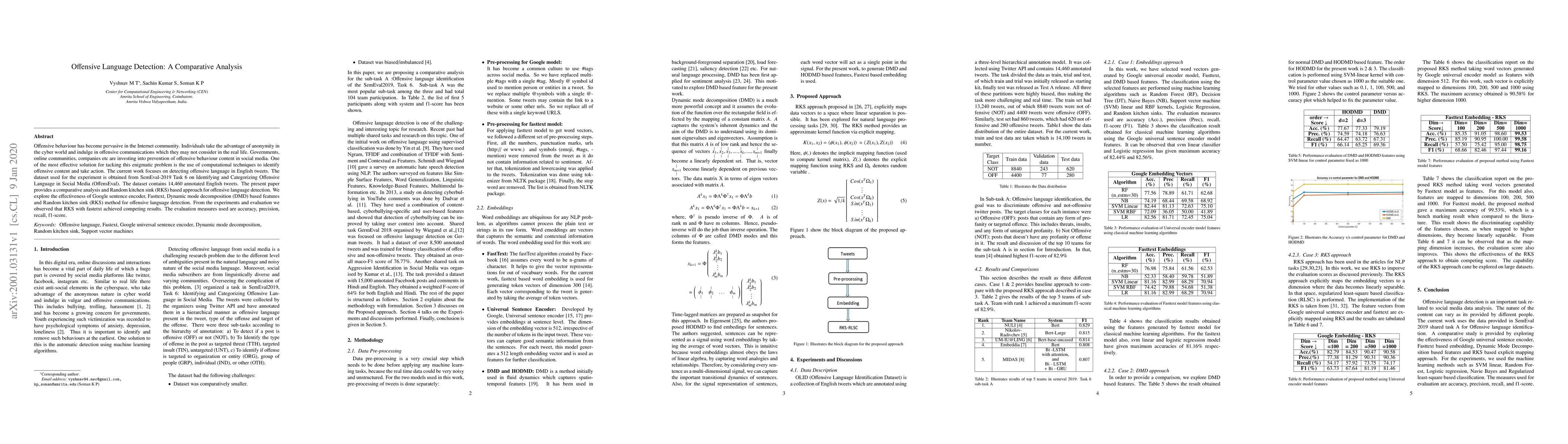 Offensive behaviour has become pervasive in the Internet community. Individuals take the advantage of anonymity in the cyber world and indulge in offensive communications which they may not consider in the real life. Governments, online communities, companies etc are investing into prevention of offensive behaviour content in social media. One of the most effective solution for tacking this enigmatic problem is the use of computational techniques to identify offensive content and take action. The current work focuses on detecting offensive language in English tweets. The dataset used for the experiment is obtained from SemEval-2019 Task 6 on Identifying and Categorizing Offensive Language in Social Media (OffensEval). The dataset contains 14,460 annotated English tweets. The present paper provides a comparative analysis and Random kitchen sink (RKS) based approach for offensive language detection. We explore the effectiveness of Google sentence encoder, Fasttext, Dynamic mode decomposition (DMD) based features and Random kitchen sink (RKS) method for offensive language detection. From the experiments and evaluation we observed that RKS with fastetxt achieved competing results. The evaluation measures used are accuracy, precision, recall, f1-score.