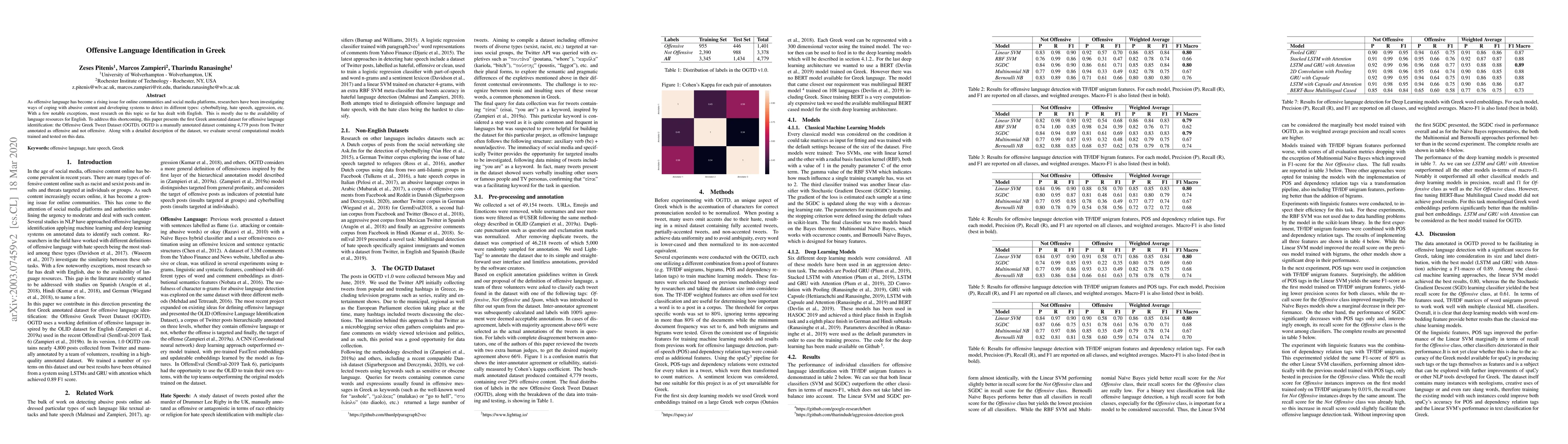 This paper introduces the first Greek annotated dataset for offensive language identification, the Offensive Greek Tweet Dataset (OGTD), and evaluates several computational models trained on this data to address the lack of resources for Greek in this research area. The dataset comprises 4,779 manually annotated Twitter posts classified as offensive or not.