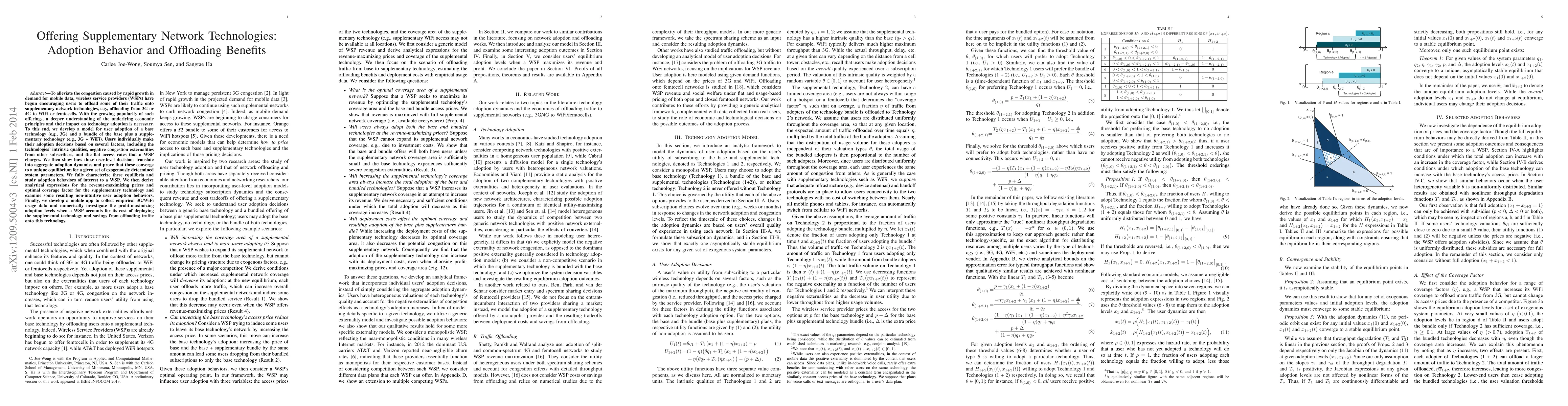 This paper models user adoption behavior for base and supplementary network technologies, analyzing the economic principles influencing decisions and the resulting offloading benefits. It derives optimal pricing and coverage strategies for wireless service providers, and uses an empirical mobile app to investigate profit-maximizing adoption levels considering deployment costs and traffic offloading savings.