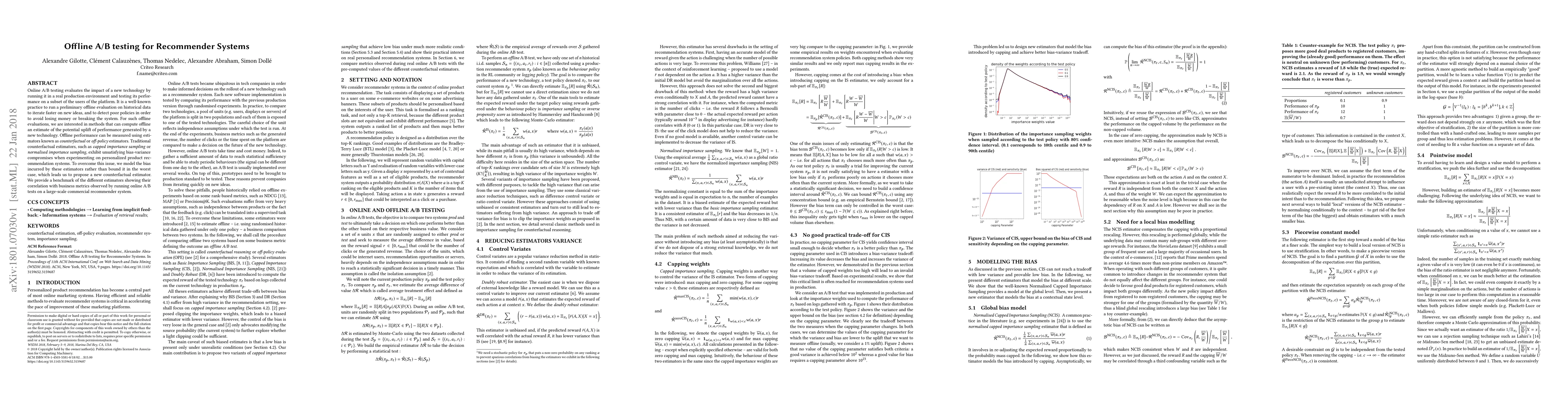Before A/B testing online a new version of a recommender system, it is usual to perform some offline evaluations on historical data. We focus on evaluation methods that compute an estimator of the potential uplift in revenue that could generate this new technology. It helps to iterate faster and to avoid losing money by detecting poor policies. These estimators are known as counterfactual or off-policy estimators. We show that traditional counterfactual estimators such as capped importance sampling and normalised importance sampling are experimentally not having satisfying bias-variance compromises in the context of personalised product recommendation for online advertising. We propose two variants of counterfactual estimates with different modelling of the bias that prove to be accurate in real-world conditions. We provide a benchmark of these estimators by showing their correlation with business metrics observed by running online A/B tests on a commercial recommender system.