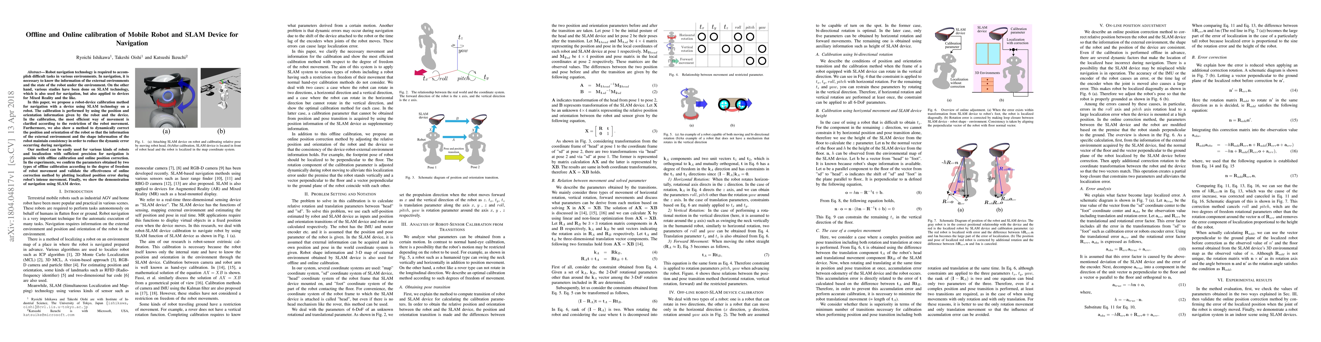 This paper proposes a calibration method for mobile robots equipped with SLAM devices to enhance navigation accuracy. It details both offline calibration and online dynamic correction to maintain consistency between external environment data and robot state, validated by experiments showing reduced localization errors.