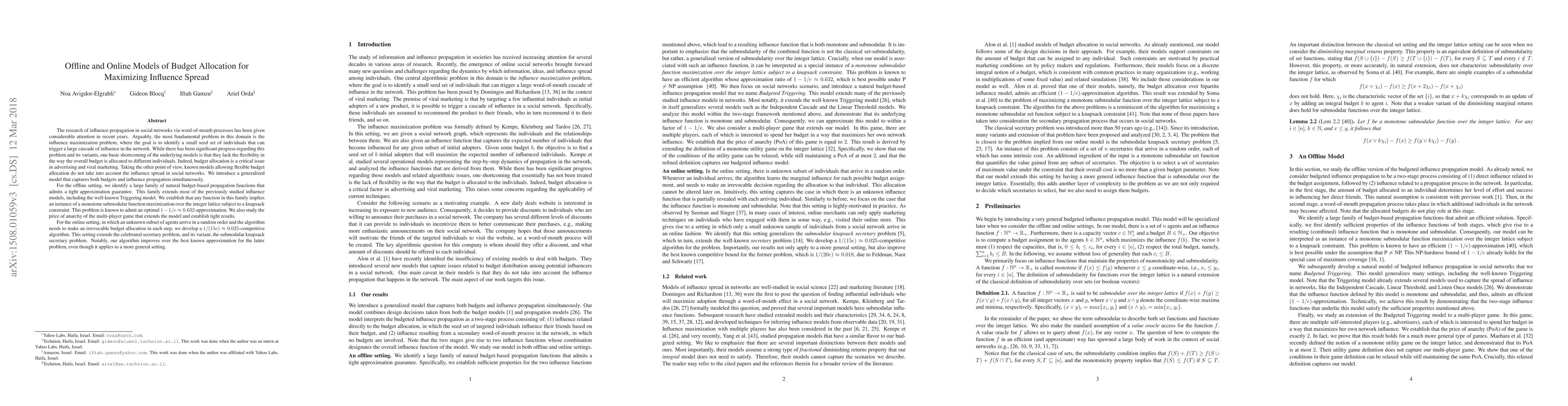 The research of influence propagation in social networks via word-of-mouth processes has been given considerable attention in recent years. Arguably, the most fundamental problem in this domain is influence maximization, where the goal is to identify a seed set of individuals that can trigger a large cascade of influence in the network. While there has been significant progress regarding this problem and its variants, one basic shortcoming of the models is that they lack the flexibility in the way the budget is allocated to individuals. Indeed, budget allocation is a critical issue in advertising and viral marketing. Taking the other point of view, known models allowing flexible budget allocation do not take into account the influence spread in the network. We introduce a generalized model that captures both budgets and influence propagation simultaneously. For the offline setting, we identify a large family of budget-based propagation functions that admit tight approximation guarantee. This family extends most of the previously studied influence models, including the well-known Triggering model. We establish that any function in this family implies an instance of a monotone submodular function maximization over the integer lattice subject to a knapsack constraint. This problem is known to admit an optimal (1-1/e)-approximation. We also study the price of anarchy of the multi-player game that extends the model and establish tight results. For the online setting, in which an unknown subset of agents arrive in a random order and the algorithm needs to make an irrevocable budget allocation in each step, we develop a 1/(15e)-competitive algorithm. This setting extends the secretary problem, and its variant, the submodular knapsack secretary problem. Notably, our algorithm improves over the best known approximation for the latter problem, even though it applies to a more general setting.