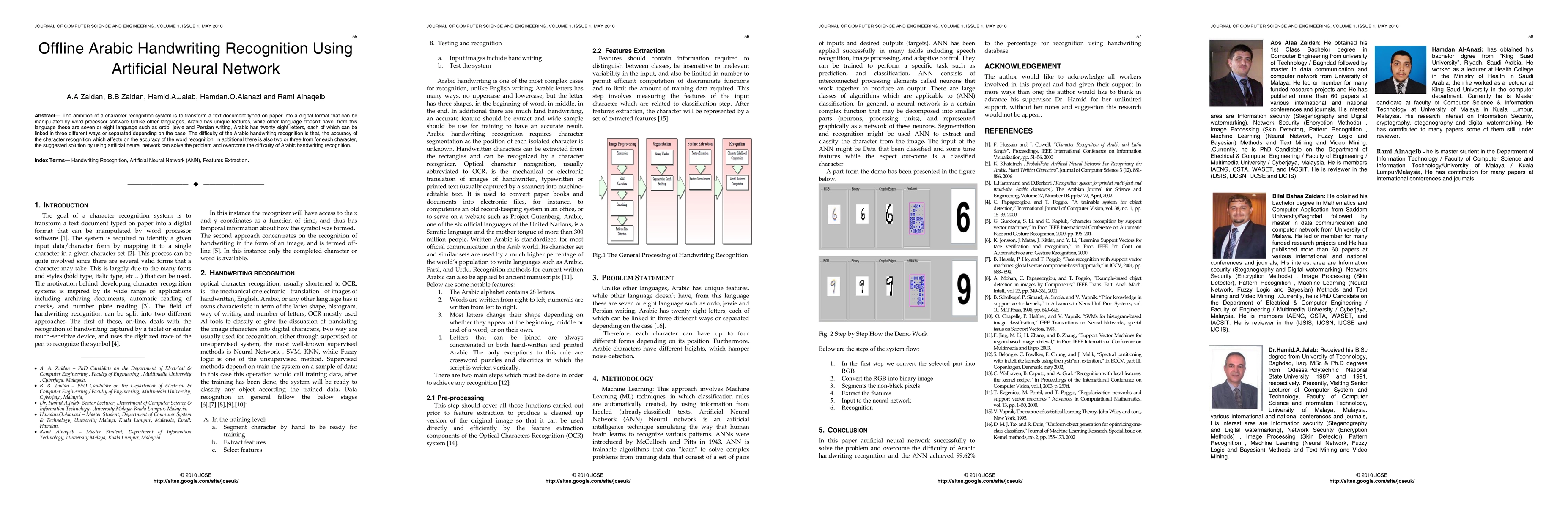 The ambition of a character recognition system is to transform a text document typed on paper into a digital format that can be manipulated by word processor software Unlike other languages, Arabic has unique features, while other language doesn't have, from this language these are seven or eight language such as ordo, jewie and Persian writing, Arabic has twenty eight letters, each of which can be linked in three different ways or separated depending on the case. The difficulty of the Arabic handwriting recognition is that, the accuracy of the character recognition which affects on the accuracy of the word recognition, in additional there is also two or three from for each character, the suggested solution by using artificial neural network can solve the problem and overcome the difficulty of Arabic handwriting recognition.