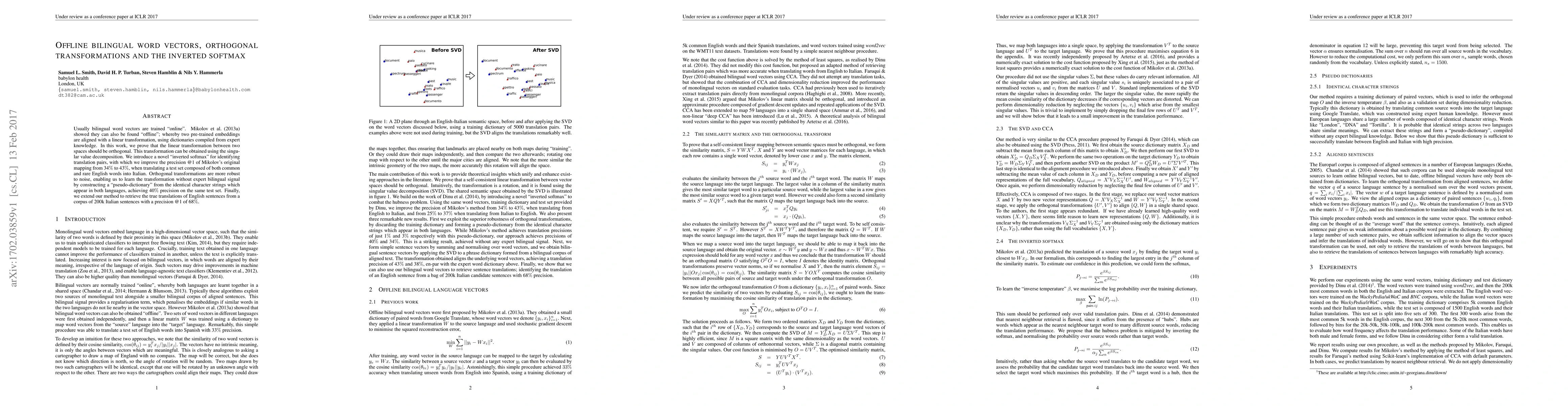 Usually bilingual word vectors are trained "online". Mikolov et al. showed they can also be found "offline", whereby two pre-trained embeddings are aligned with a linear transformation, using dictionaries compiled from expert knowledge. In this work, we prove that the linear transformation between two spaces should be orthogonal. This transformation can be obtained using the singular value decomposition. We introduce a novel "inverted softmax" for identifying translation pairs, with which we improve the precision @1 of Mikolov's original mapping from 34% to 43%, when translating a test set composed of both common and rare English words into Italian. Orthogonal transformations are more robust to noise, enabling us to learn the transformation without expert bilingual signal by constructing a "pseudo-dictionary" from the identical character strings which appear in both languages, achieving 40% precision on the same test set. Finally, we extend our method to retrieve the true translations of English sentences from a corpus of 200k Italian sentences with a precision @1 of 68%.