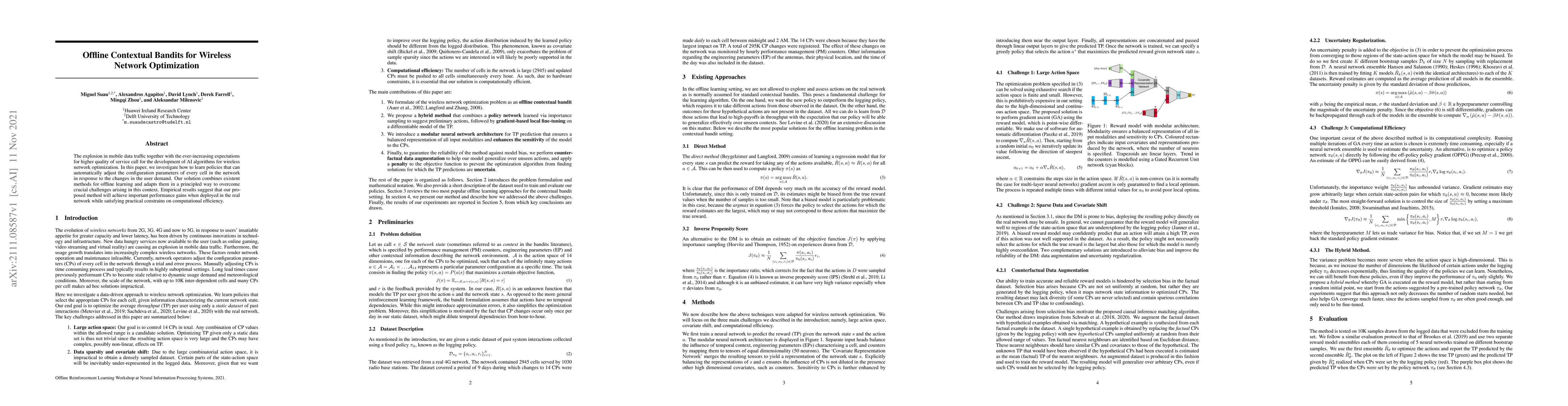 The explosion in mobile data traffic together with the ever-increasing expectations for higher quality of service call for the development of AI algorithms for wireless network optimization. In this paper, we investigate how to learn policies that can automatically adjust the configuration parameters of every cell in the network in response to the changes in the user demand. Our solution combines existent methods for offline learning and adapts them in a principled way to overcome crucial challenges arising in this context. Empirical results suggest that our proposed method will achieve important performance gains when deployed in the real network while satisfying practical constrains on computational efficiency.
