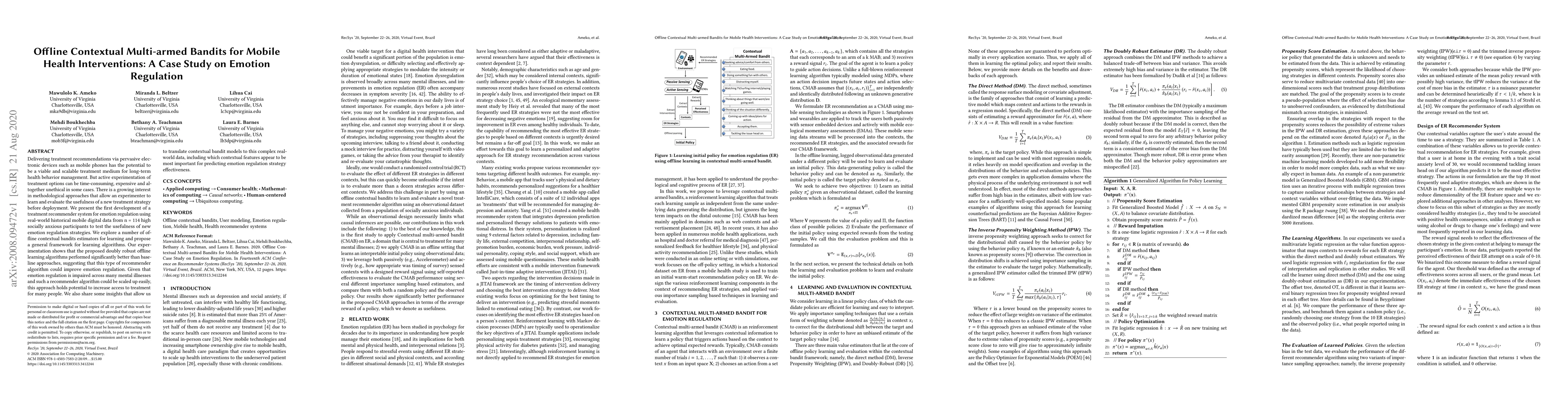 This paper develops a treatment recommender system for emotion regulation using offline contextual multi-armed bandit algorithms, demonstrating improved performance over baselines. The study suggests that such algorithms could enhance access to scalable mental health interventions for various conditions.