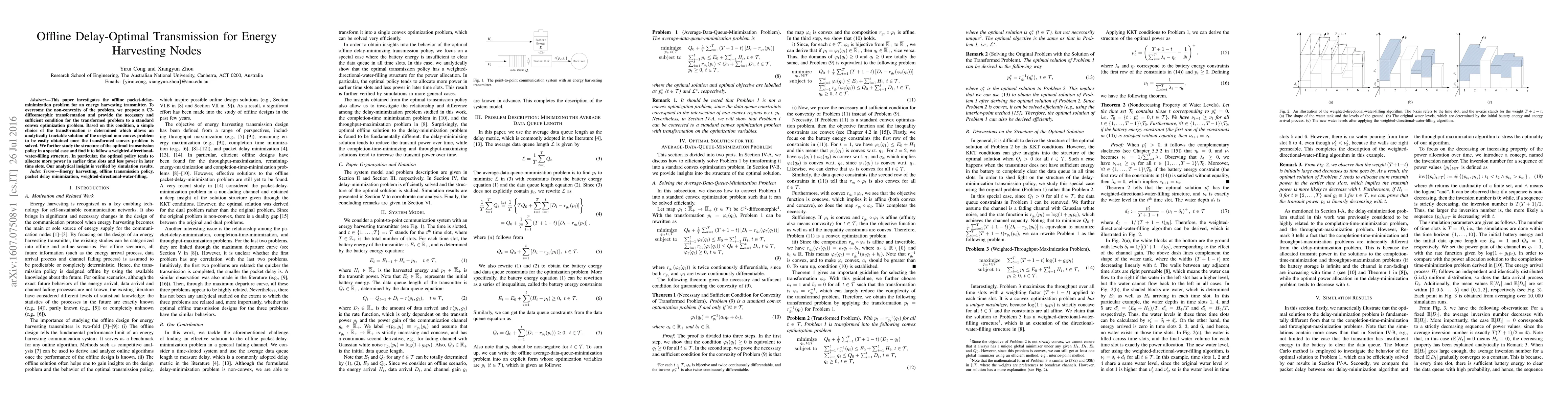 This research proposes a C2-diffeomorphic transformation to solve the offline packet-delay-minimization problem for energy harvesting transmitters, converting a non-convex problem into a convex one. The solution follows a weighted-directional-water-filling structure, allocating more power to earlier time slots and less to later ones, verified through simulations.