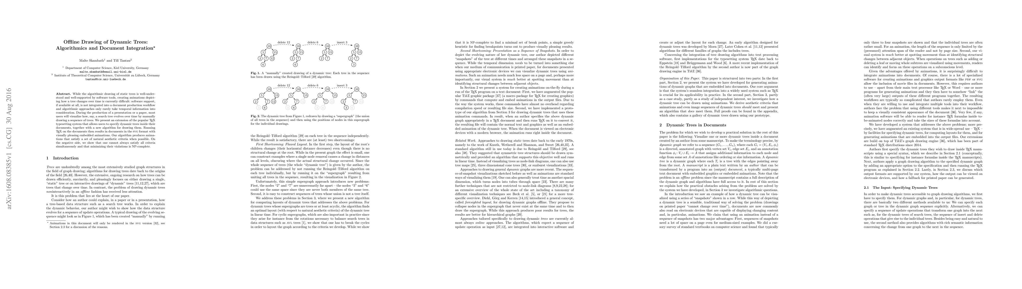 While the algorithmic drawing of static trees is well-understood and well-supported by software tools, creating animations depicting how a tree changes over time is currently difficult: software support, if available at all, is not integrated into a document production workflow and algorithmic approaches only rarely take temporal information into consideration. During the production of a presentation or a paper, most users will visualize how, say, a search tree evolves over time by manually drawing a sequence of trees. We present an extension of the popular $\TeX$ typesetting system that allows users to specify dynamic trees inside their documents, together with a new algorithm for drawing them. Running $\TeX$ on the documents then results in documents in the SVG format with visually pleasing embedded animations. Our algorithm produces animations that satisfy a set of natural aesthetic criteria when possible. On the negative side, we show that one cannot always satisfy all criteria simultaneously and that minimizing their violations is NP-complete.