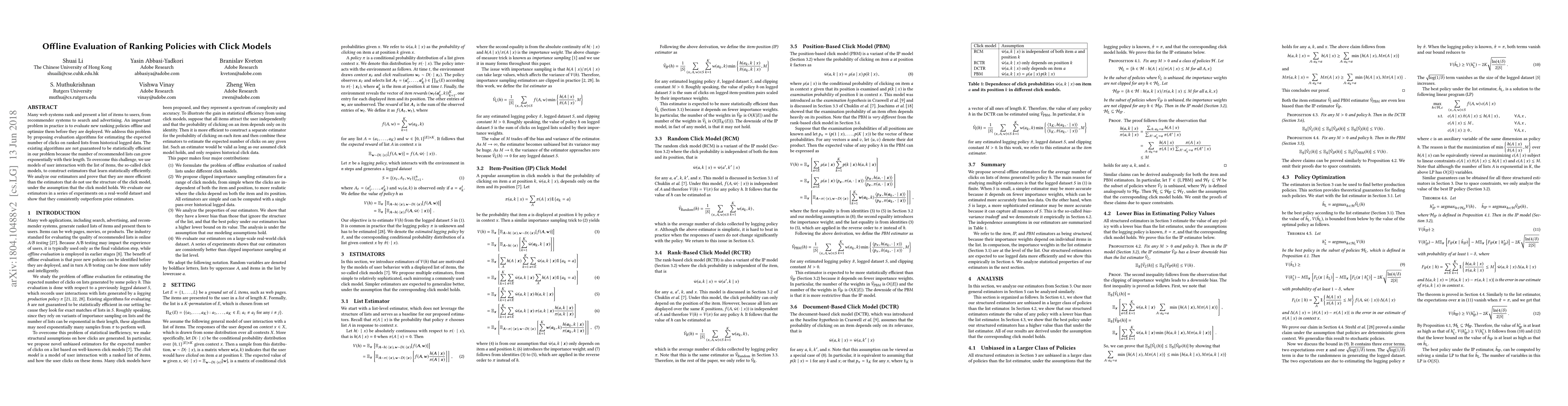 This paper proposes new evaluation algorithms for offline ranking policies using click models to estimate click-through rates from historical data. The proposed estimators are statistically efficient and outperform existing methods, as demonstrated through experiments on a real-world dataset.