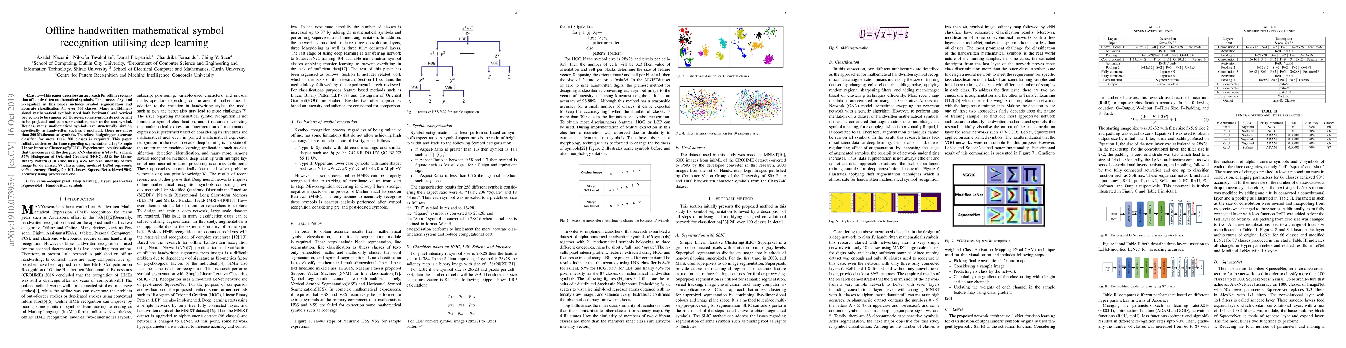 This paper describes an approach for offline recognition of handwritten mathematical symbols. The process of symbol recognition in this paper includes symbol segmentation and accurate classification for over 300 classes. Many multidimensional mathematical symbols need both horizontal and vertical projection to be segmented. However, some symbols do not permit to be projected and stop segmentation, such as the root symbol. Besides, many mathematical symbols are structurally similar, specifically in handwritten such as 0 and null. There are more than 300 Mathematical symbols. Therefore, designing an accurate classifier for more than 300 classes is required. This paper initially addresses the issue regarding segmentation using Simple Linear Iterative Clustering (SLIC). Experimental results indicate that the accuracy of the designed kNN classifier is 84% for salient, 57% Histogram of Oriented Gradient (HOG), 53% for Linear Binary Pattern (LBP) and finally 43% for pixel intensity of raw image for 66 classes. 87 classes using modified LeNet represents 90% accuracy. Finally, for 101 classes, SqueezeNet ac