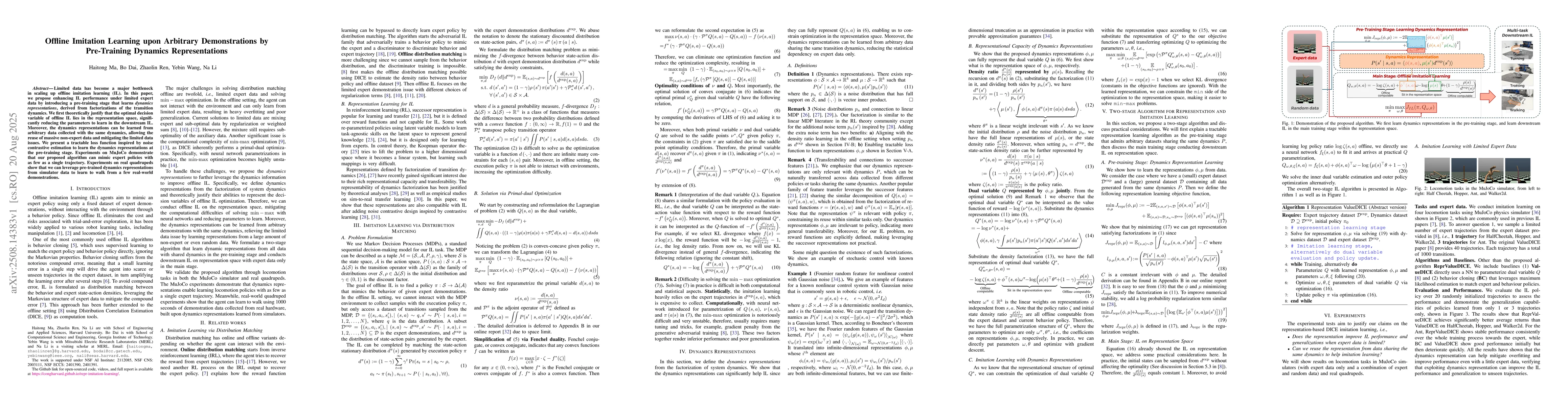 This research addresses the challenge of limited data in offline imitation learning by introducing a pre-training stage that learns dynamics representations, improving performance and generalization.