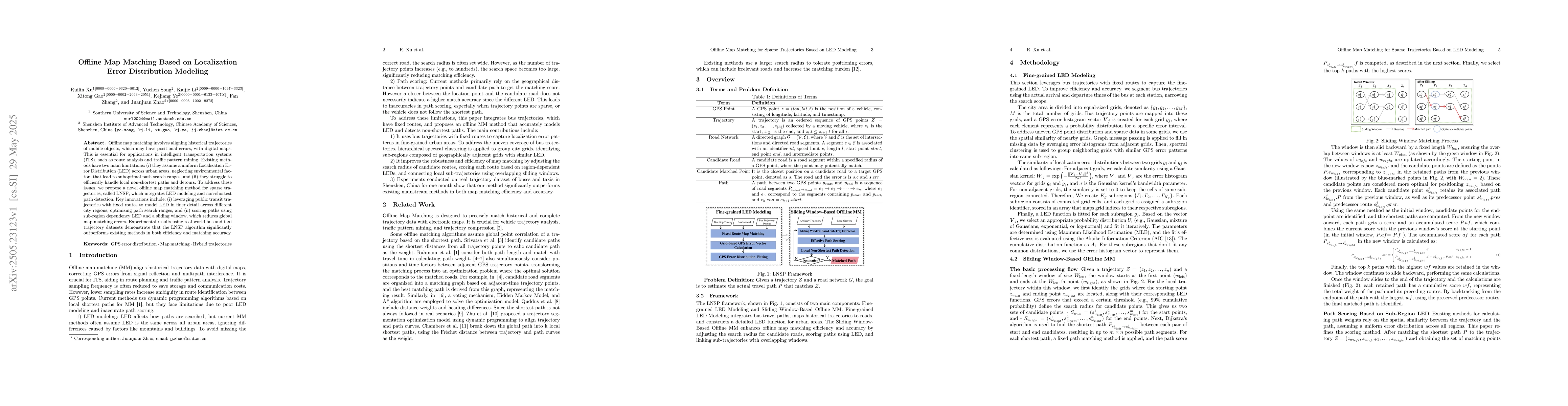 The research proposes LNSP, an offline map matching method for sparse trajectories that integrates Localization Error Distribution (LED) modeling and non-shortest path detection. It models LED in finer detail using public transit trajectories with fixed routes, optimizing path search ranges. A sliding window approach is used to score paths based on sub-region dependency LED, reducing global map matching errors.