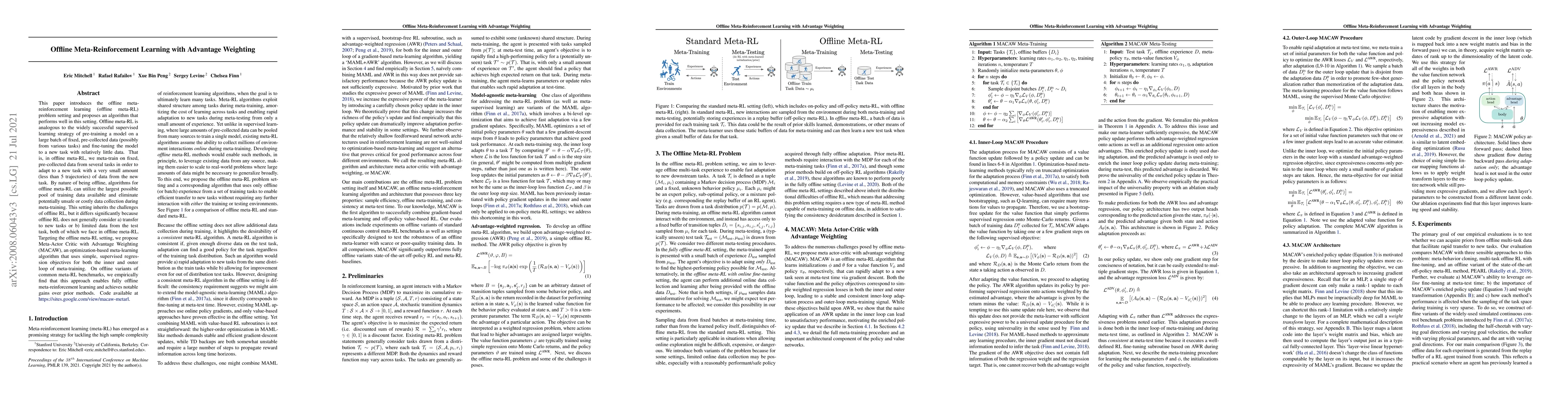 The paper presents Meta-Actor Critic with Advantage Weighting (MACAW), an optimization-based meta-RL algorithm that performs well in the offline meta-RL setting.