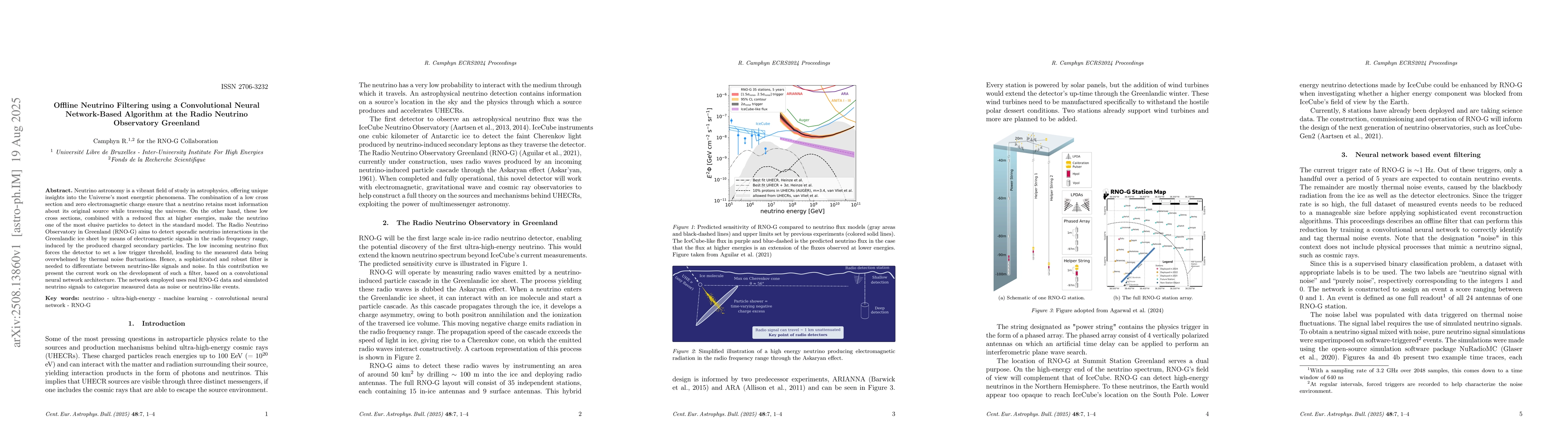 The paper discusses the development of a convolutional neural network-based filter for the Radio Neutrino Observatory Greenland (RNO-G) to distinguish neutrino signals from thermal noise. The filter uses real RNO-G data and simulated neutrino signals, aiming to address the challenge posed by the low neutrino flux and high thermal noise in the ice sheet.
