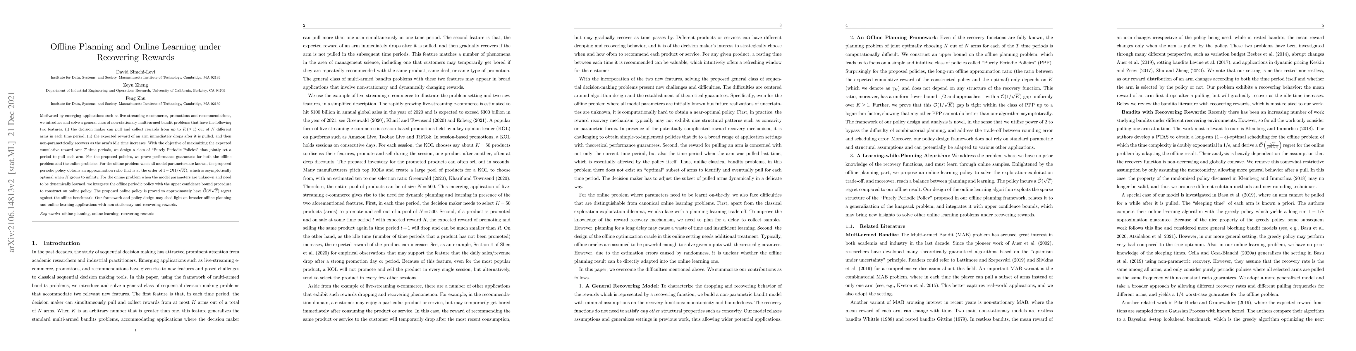 This paper addresses non-stationary multi-armed bandit problems where rewards recover over time, proposing "Purely Periodic Policies" to maximize cumulative rewards. It achieves optimal offline performance and constructs an online policy with $\widetilde{\mathcal O}(N\sqrt{T})$ regret, applicable to dynamic reward scenarios like live-streaming e-commerce.