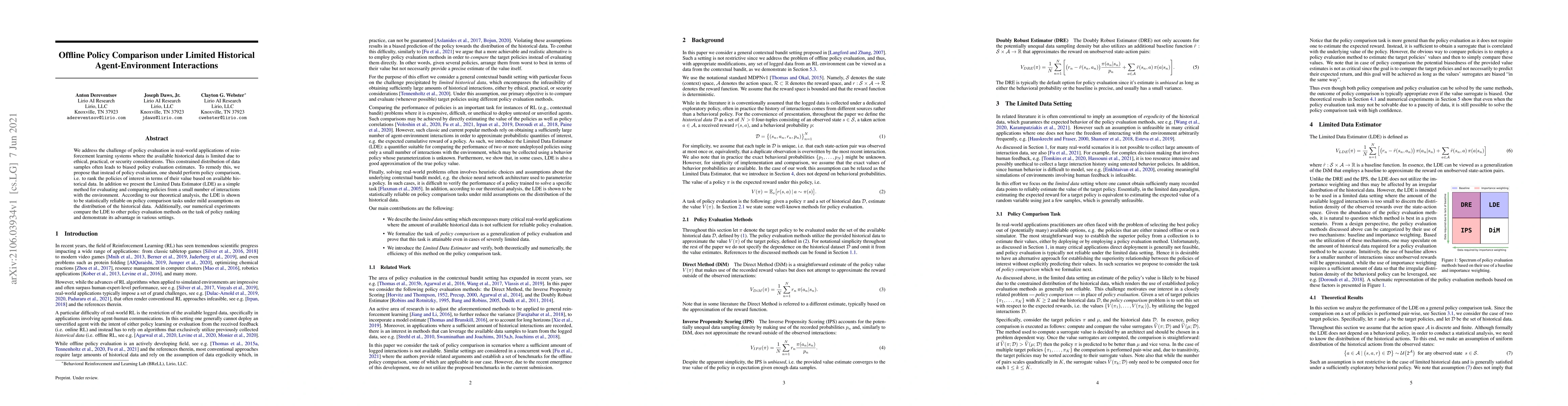 We address the challenge of policy evaluation in real-world applications of reinforcement learning systems where the available historical data is limited due to ethical, practical, or security considerations. This constrained distribution of data samples often leads to biased policy evaluation estimates. To remedy this, we propose that instead of policy evaluation, one should perform policy comparison, i.e. to rank the policies of interest in terms of their value based on available historical data. In addition we present the Limited Data Estimator (LDE) as a simple method for evaluating and comparing policies from a small number of interactions with the environment. According to our theoretical analysis, the LDE is shown to be statistically reliable on policy comparison tasks under mild assumptions on the distribution of the historical data. Additionally, our numerical experiments compare the LDE to other policy evaluation methods on the task of policy ranking and demonstrate its advantage in various settings.