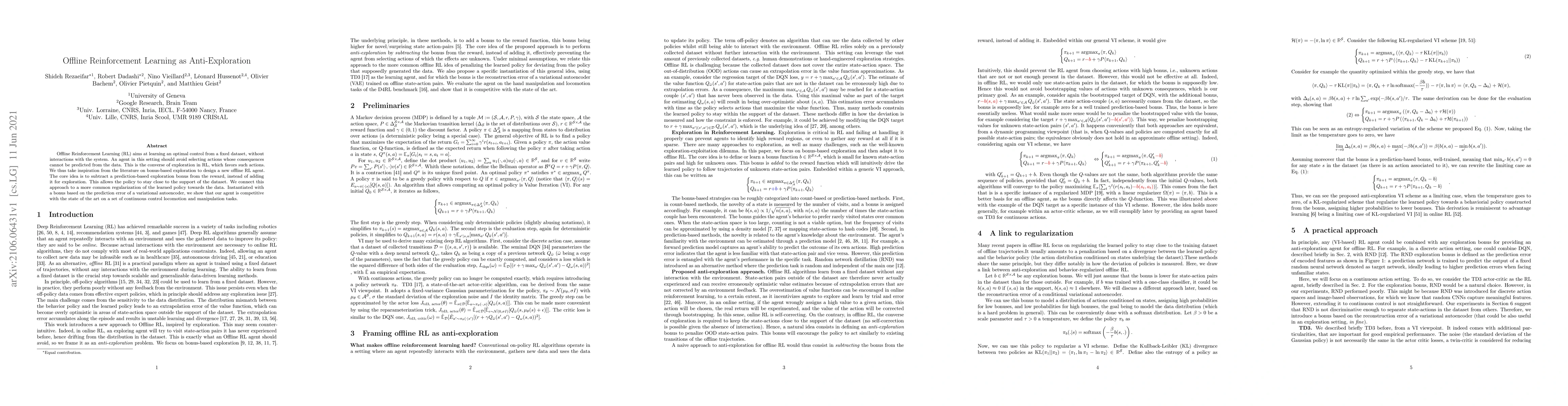 This paper proposes an offline Reinforcement Learning (RL) agent that avoids selecting actions based on prediction-based exploration bonuses, contrasting with traditional exploration methods. The agent uses a prediction error bonus to regularize the policy towards the dataset, achieving competitive performance on continuous control tasks.