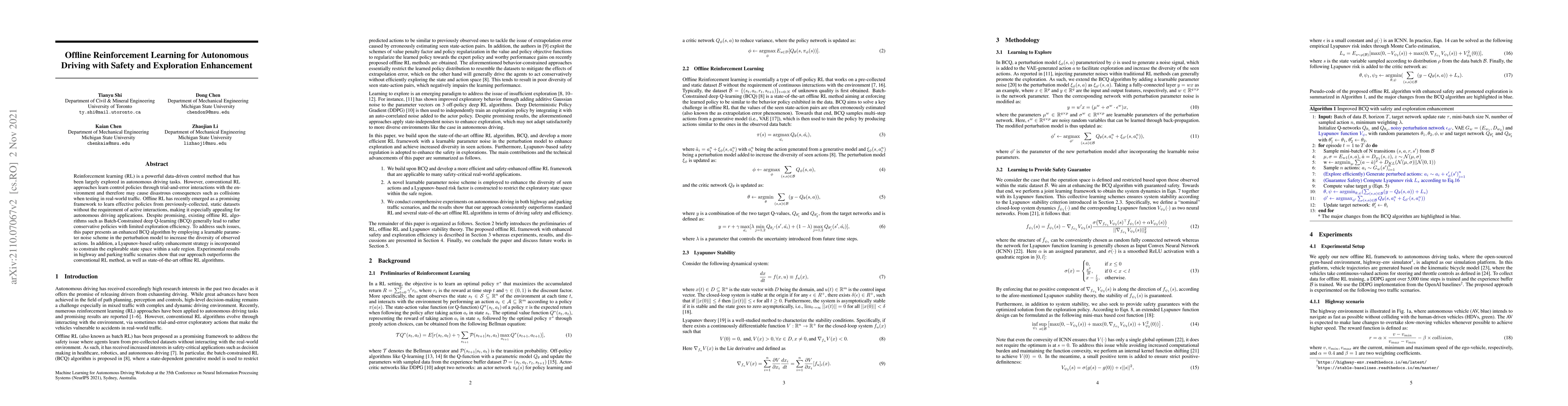 Reinforcement learning (RL) is a powerful data-driven control method that has been largely explored in autonomous driving tasks. However, conventional RL approaches learn control policies through trial-and-error interactions with the environment and therefore may cause disastrous consequences such as collisions when testing in real-world traffic. Offline RL has recently emerged as a promising framework to learn effective policies from previously-collected, static datasets without the requirement of active interactions, making it especially appealing for autonomous driving applications. Despite promising, existing offline RL algorithms such as Batch-Constrained deep Q-learning (BCQ) generally lead to rather conservative policies with limited exploration efficiency. To address such issues, this paper presents an enhanced BCQ algorithm by employing a learnable parameter noise scheme in the perturbation model to increase the diversity of observed actions. In addition, a Lyapunov-based safety enhancement strategy is incorporated to constrain the explorable state space within a safe region. Experimental results in highway and parking traffic scenarios show that our approach outperforms the conventional RL method, as well as state-of-the-art offline RL algorithms.