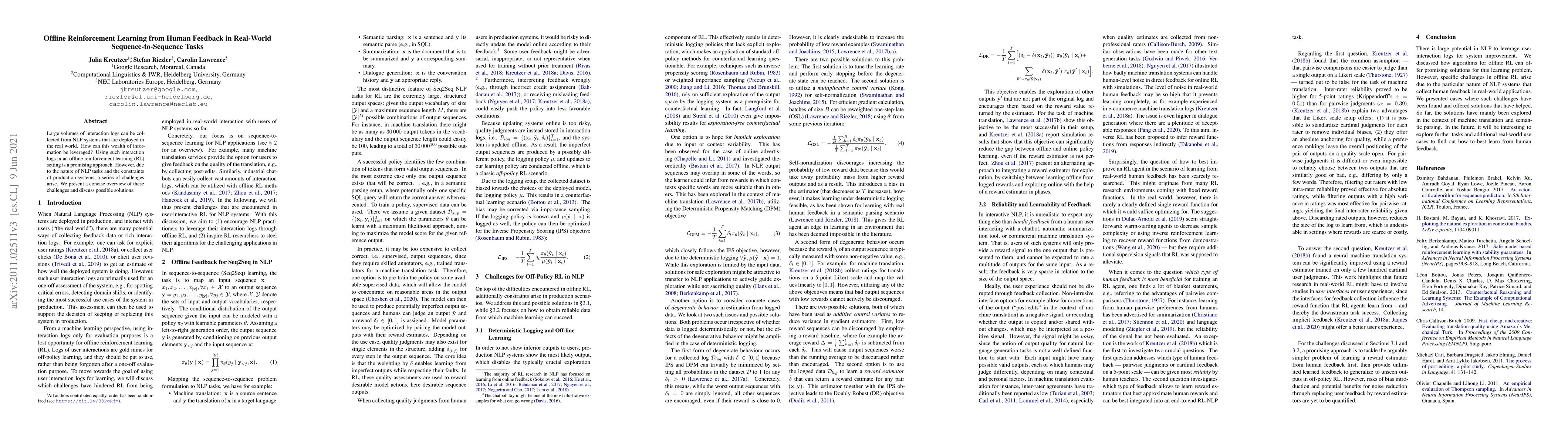 This paper explores leveraging large volumes of interaction logs from deployed NLP systems in offline reinforcement learning, addressing the challenges unique to NLP tasks and production constraints, and proposes potential solutions.