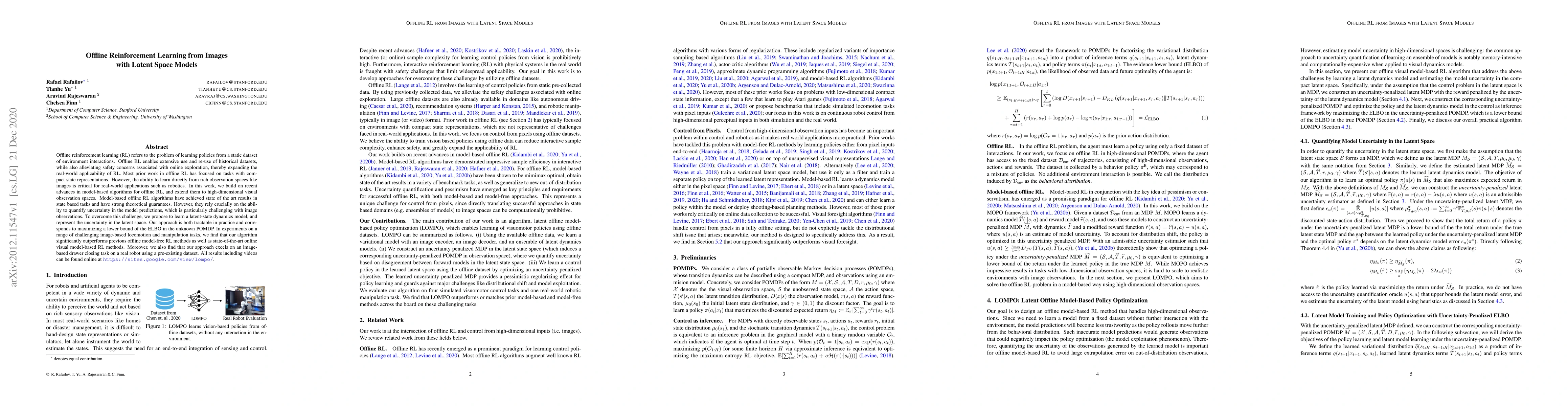 This paper proposes a model-based offline reinforcement learning approach that leverages latent space dynamics models to handle high-dimensional visual observations. The method outperforms previous offline model-free and state-of-the-art online visual model-based RL methods in various image-based tasks and demonstrates effectiveness on a real-world robot drawer closing task.
