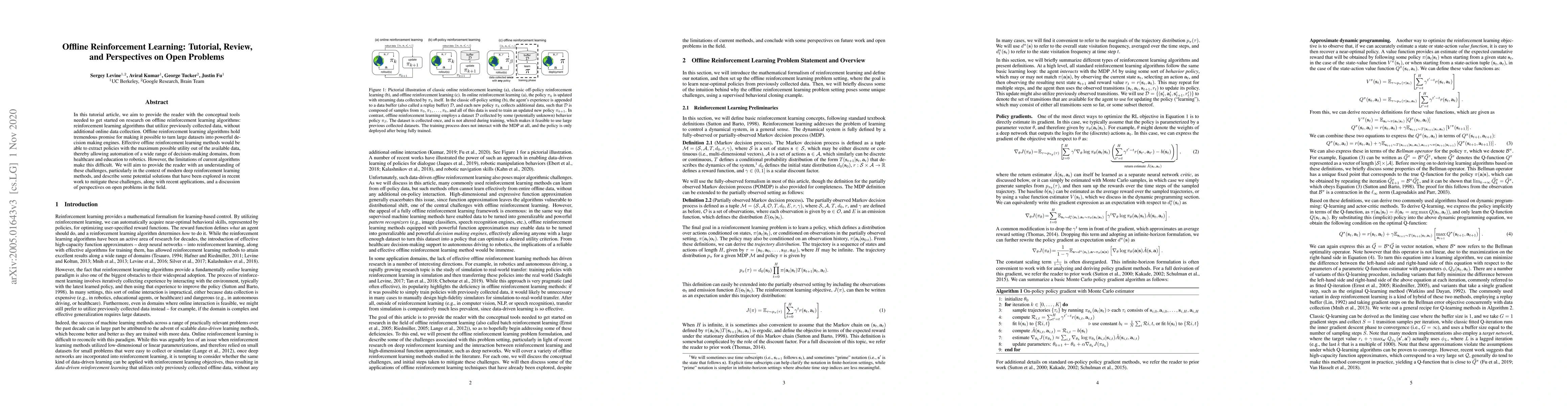 This paper offers a comprehensive tutorial on offline reinforcement learning, focusing on the use of pre-collected data to develop decision-making algorithms. It highlights current challenges and limitations, particularly in the context of deep reinforcement learning, and discusses potential solutions and open problems for future research.
