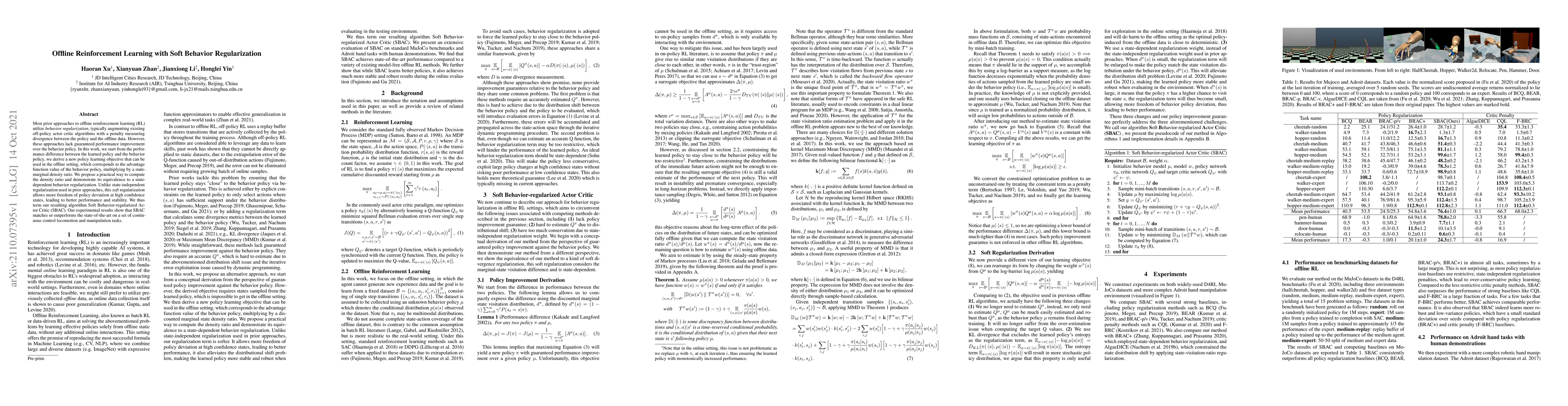 This paper introduces the Soft Behavior-regularized Actor Critic (SBAC) algorithm for offline reinforcement learning, which employs a novel soft behavior regularization method that allows for more policy deviation in high confidence states, leading to improved performance and stability compared to prior state-independent regularization techniques. The results demonstrate SBAC's competitive performance on continuous control tasks.