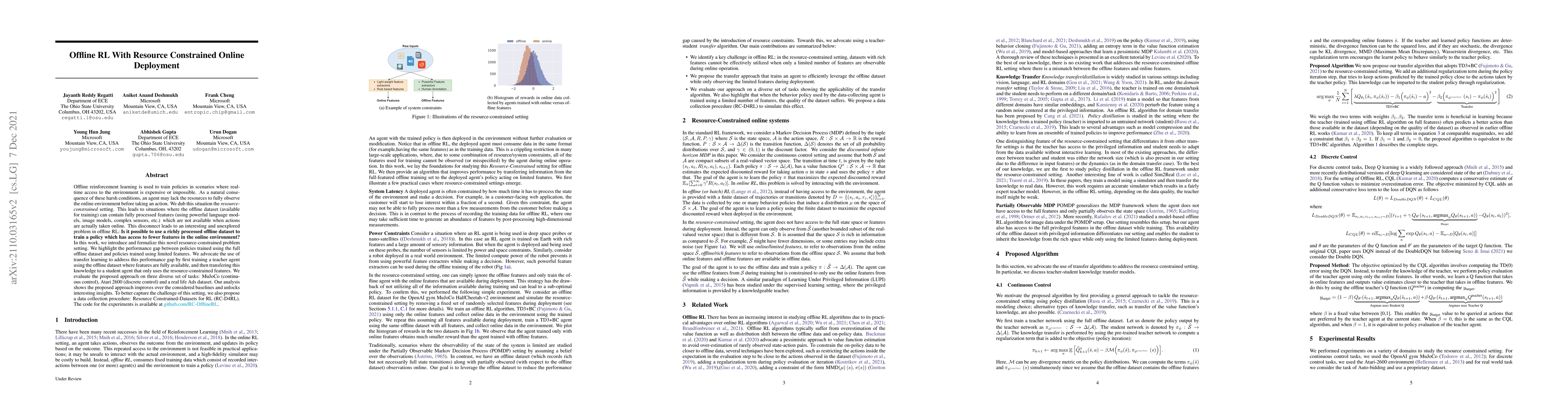 Offline reinforcement learning is used to train policies in scenarios where real-time access to the environment is expensive or impossible. As a natural consequence of these harsh conditions, an agent may lack the resources to fully observe the online environment before taking an action. We dub this situation the resource-constrained setting. This leads to situations where the offline dataset (available for training) can contain fully processed features (using powerful language models, image models, complex sensors, etc.) which are not available when actions are actually taken online. This disconnect leads to an interesting and unexplored problem in offline RL: Is it possible to use a richly processed offline dataset to train a policy which has access to fewer features in the online environment? In this work, we introduce and formalize this novel resource-constrained problem setting. We highlight the performance gap between policies trained using the full offline dataset and policies trained using limited features. We address this performance gap with a policy transfer algorithm which first trains a teacher agent using the offline dataset where features are fully available, and then transfers this knowledge to a student agent that only uses the resource-constrained features. To better capture the challenge of this setting, we propose a data collection procedure: Resource Constrained-Datasets for RL (RC-D4RL). We evaluate our transfer algorithm on RC-D4RL and the popular D4RL benchmarks and observe consistent improvement over the baseline (TD3+BC without transfer). The code for the experiments is available at https://github.com/JayanthRR/RC-OfflineRL.