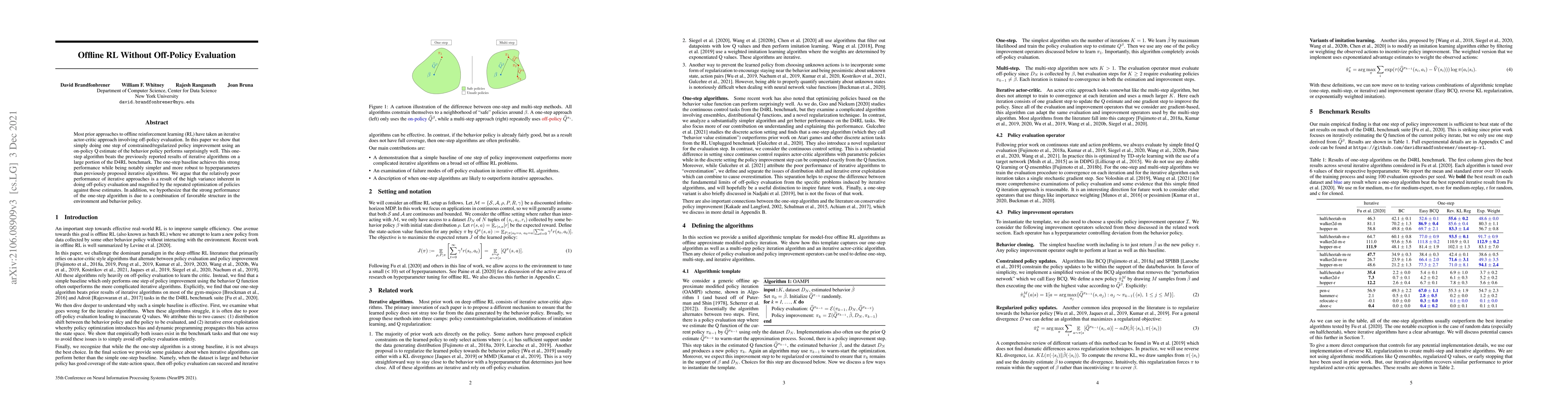 This paper proposes a one-step algorithm for offline reinforcement learning that achieves superior performance compared to iterative methods, which rely on off-policy evaluation. The simplicity and robustness of the one-step approach suggest that iterative methods suffer from high variance in off-policy evaluation, while the one-step algorithm benefits from the structure of the environment and behavior policy.