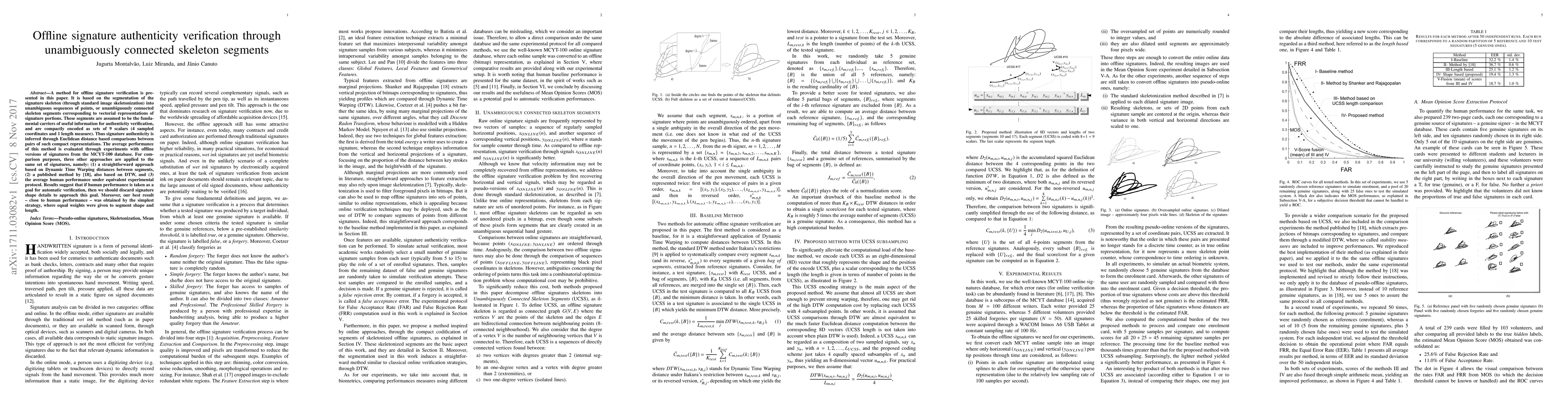 A method for offline signature verification is presented in this paper. It is based on the segmentation of the signature skeleton (through standard image skeletonization) into unambiguous sequences of points, or unambiguously connected skeleton segments corresponding to vectorial representations of signature portions. These segments are assumed to be the fundamental carriers of useful information for authenticity verification, and are compactly encoded as sets of 9 scalars (4 sampled coordinates and 1 length measure). Thus signature authenticity is inferred through Euclidean distance based comparisons between pairs of such compact representations. The average performance of this method is evaluated through experiments with offline versions of signatures from the MCYT-100 database. For comparison purposes, three other approaches are applied to the same set of signatures, namely: (1) a straightforward approach based on Dynamic Time Warping distances between segments, (2) a published method by [shanker2007], also based on DTW, and (3) the average human performance under equivalent experimental protocol. Results suggest that if human performance is taken as a goal for automatic verification, then we should discard signature shape details to approach this goal. Moreover, our best result -- close to human performance -- was obtained by the simplest strategy, where equal weights were given to segment shape and length.