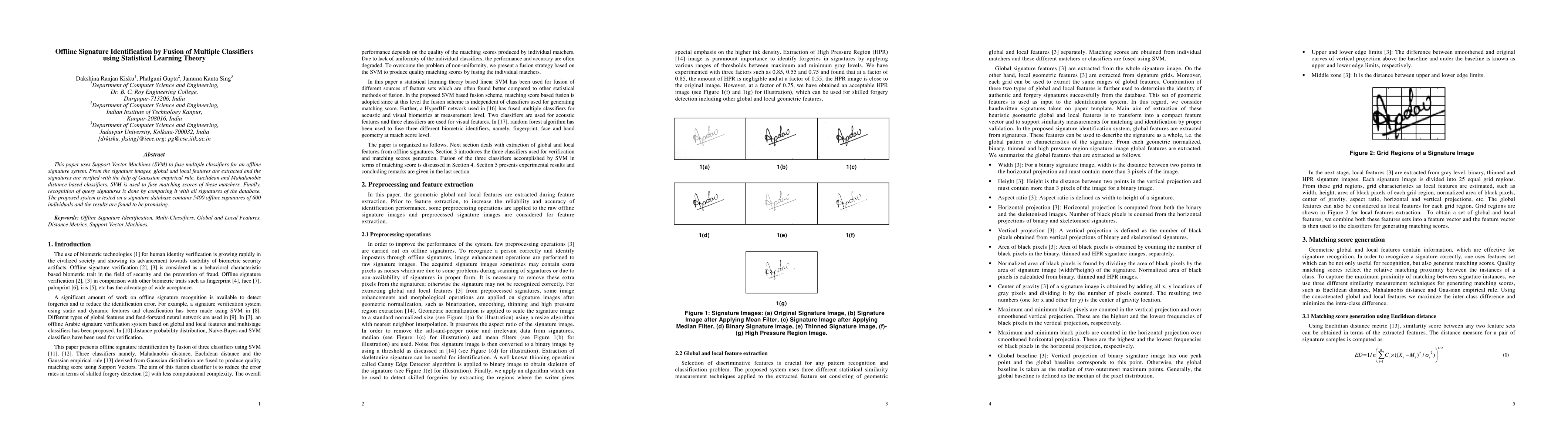 This paper uses Support Vector Machines (SVM) to fuse multiple classifiers for an offline signature system. From the signature images, global and local features are extracted and the signatures are verified with the help of Gaussian empirical rule, Euclidean and Mahalanobis distance based classifiers. SVM is used to fuse matching scores of these matchers. Finally, recognition of query signatures is done by comparing it with all signatures of the database. The proposed system is tested on a signature database contains 5400 offline signatures of 600 individuals and the results are found to be promising.