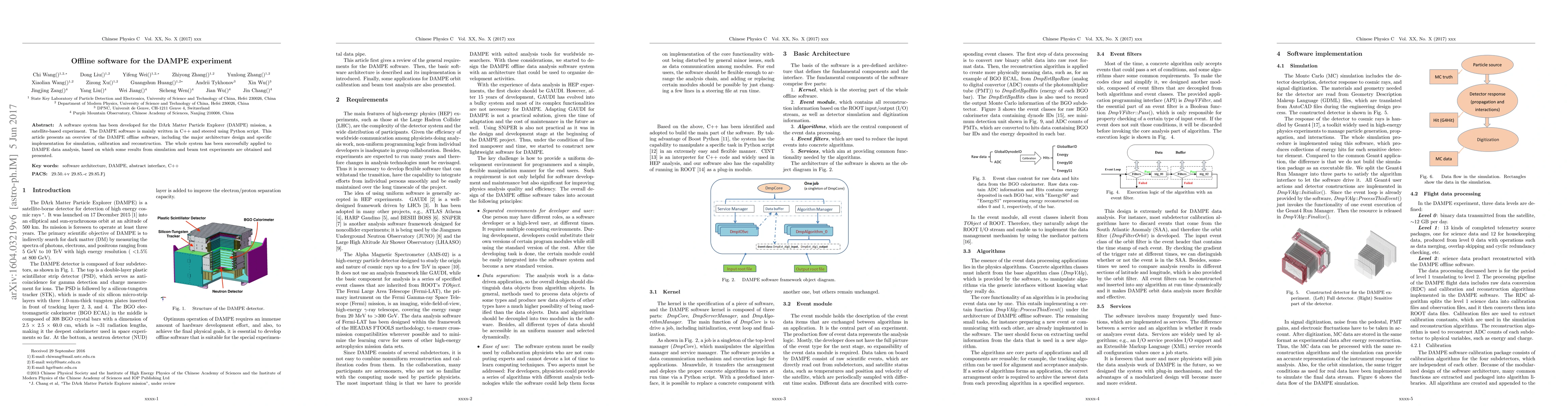The DAMPE offline software system, primarily written in C++ and controlled via Python scripts, facilitates the analysis of data from the DArk Matter Particle Explorer satellite mission. It encompasses architecture design and implementation for simulation, calibration, and reconstruction, successfully applied to data analysis with results from simulations and beam tests.