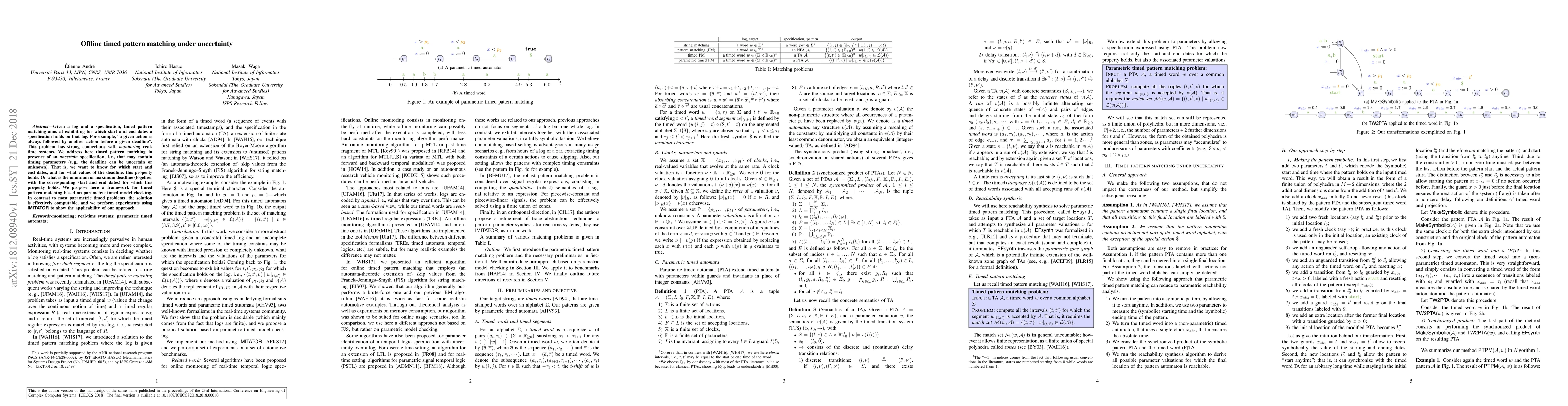 Given a log and a specification, timed pattern matching aims at exhibiting for which start and end dates a specification holds on that log. For example, "a given action is always followed by another action before a given deadline". This problem has strong connections with monitoring real-time systems. We address here timed pattern matching in presence of an uncertain specification, i.e., that may contain timing parameters (e.g., the deadline can be uncertain or unknown). That is, we want to know for which start and end dates, and for what values of the deadline, this property holds. Or what is the minimum or maximum deadline (together with the corresponding start and end dates) for which this property holds. We propose here a framework for timed pattern matching based on parametric timed model checking. In contrast to most parametric timed problems, the solution is effectively computable, and we perform experiments using IMITATOR to show the applicability of our approach.