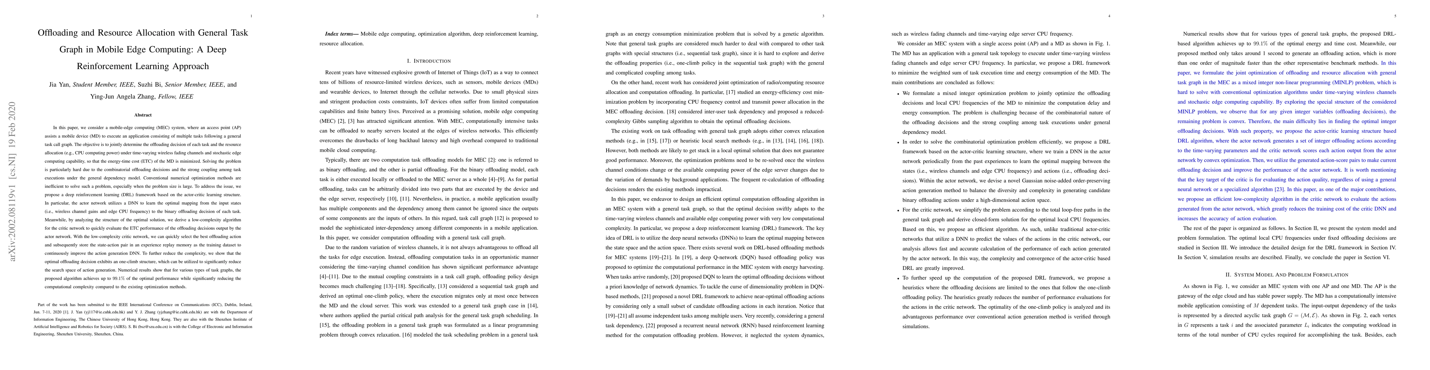 In this paper, we consider a mobile-edge computing system, where an access point assists a mobile device (MD) to execute an application consisting of multiple tasks following a general task call graph. The objective is to jointly determine the offloading decision of each task and the resource allocation under time-varying wireless fading channels and stochastic edge computing capability, so that the energy-time cost (ETC) of the MD is minimized. Solving the problem is particularly hard due to the combinatorial offloading decisions and the strong coupling among task executions under the general dependency model. Conventional numerical optimization methods are inefficient to solve such a problem, especially when the problem size is large. To address the issue, we propose a deep reinforcement learning (DRL) framework based on the actor-critic learning structure. In particular, the actor network utilizes a DNN to learn the optimal mapping from the input states to the binary offloading decision of each task. Meanwhile, by analyzing the structure of the optimal solution, we derive a low-complexity algorithm for the critic network to quickly evaluate the ETC performance of the offloading decisions output by the actor network. With the low-complexity critic network, we can quickly select the best offloading action and subsequently store the state-action pair in an experience replay memory as the training dataset to continuously improve the action generation DNN. To further reduce the complexity, we show that the optimal offloading decision exhibits an one-climb structure, which can be utilized to significantly reduce the search space of action generation. Numerical results show that for various types of task graphs, the proposed algorithm achieves up to $99.1\%$ of the optimal performance while significantly reducing the computational complexity compared to the existing optimization methods.