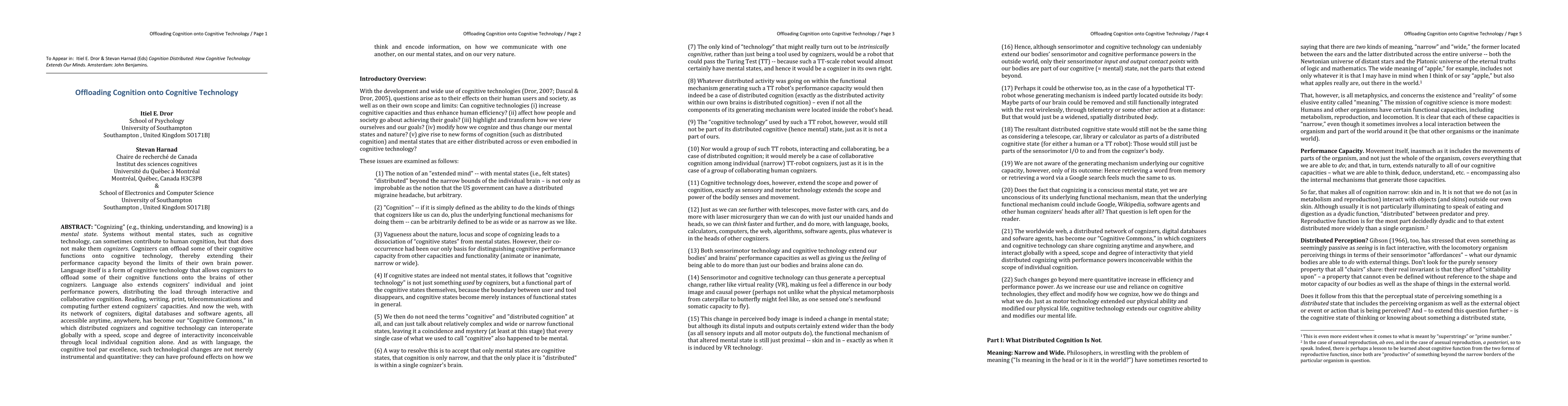 "Cognizing" (e.g., thinking, understanding, and knowing) is a mental state. Systems without mental states, such as cognitive technology, can sometimes contribute to human cognition, but that does not make them cognizers. Cognizers can offload some of their cognitive functions onto cognitive technology, thereby extending their performance capacity beyond the limits of their own brain power. Language itself is a form of cognitive technology that allows cognizers to offload some of their cognitive functions onto the brains of other cognizers. Language also extends cognizers' individual and joint performance powers, distributing the load through interactive and collaborative cognition. Reading, writing, print, telecommunications and computing further extend cognizers' capacities. And now the web, with its network of cognizers, digital databases and software agents, all accessible anytime, anywhere, has become our 'Cognitive Commons,' in which distributed cognizers and cognitive technology can interoperate globally with a speed, scope and degree of interactivity inconceivable through local individual cognition alone. And as with language, the cognitive tool par excellence, such technological changes are not merely instrumental and quantitative: they can have profound effects on how we think and encode information, on how we communicate with one another, on our mental states, and on our very nature.