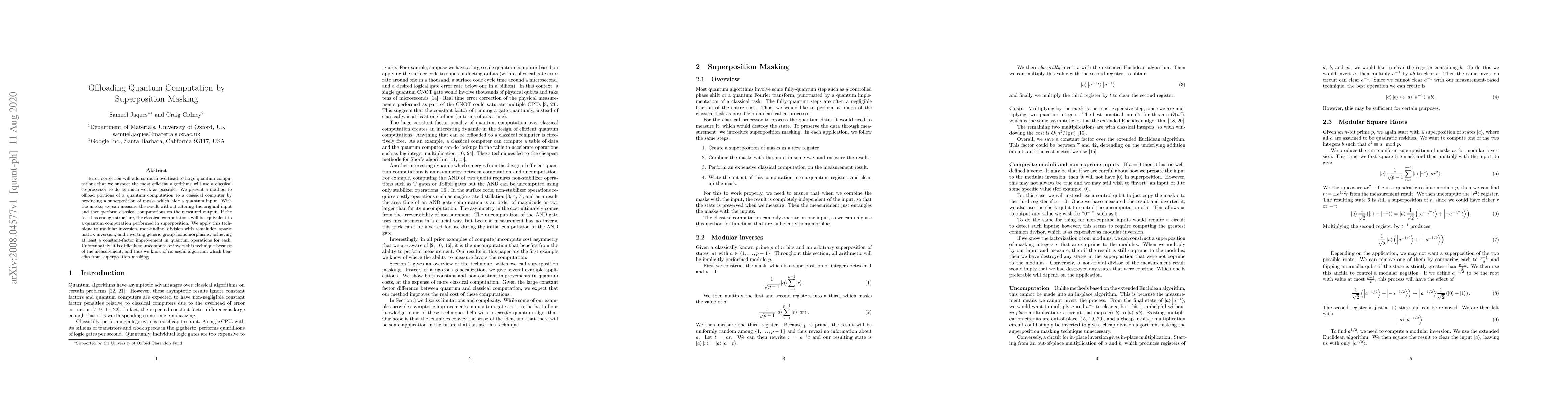 Researchers developed a method to offload parts of quantum computations to classical computers, achieving constant-factor improvements in quantum operations for certain tasks. This technique uses superposition masking to hide the original input while measuring the result, enabling equivalent classical calculations.