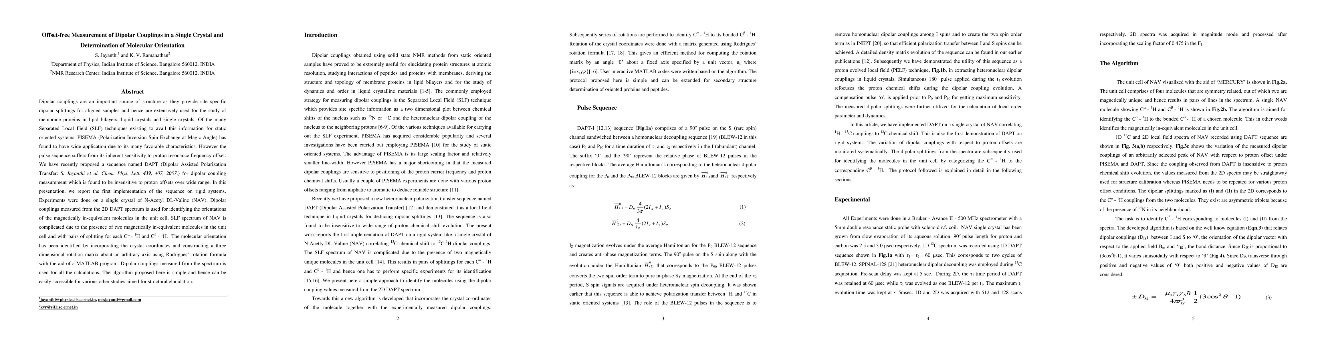 Dipolar couplings are an important source of structure as they provide site specific dipolar splittings for aligned samples and hence are extensively used for the study of membrane proteins in lipid bilayers, liquid crystals and single crystals. Of the many Separated Local Field (SLF) techniques existing to avail this information for static oriented systems, PISEMA (Polarization Inversion Spin Exchange at Magic Angle) has found to have wide application due to its many favorable characteristics. However the pulse sequence suffers from its inherent sensitivity to proton resonance frequency offset. We have recently proposed a sequence named DAPT (Dipolar Assisted Polarization Transfer: S. Jayanthi et al. Chem. Phys. Lett. 439, 407, 2007.) for dipolar coupling measurement which is found to be insensitive to proton offsets over wide range. In this presentation, we report the first implementation of the sequence on rigid systems. Experiments were done on a single crystal of N-Acetyl DL-Valine (NAV). Dipolar couplings measured from the 2D DAPT spectrum is used for identifying the orientations of the magnetically in-equivalent molecules in the unit cell. SLF spectrum of NAV is complicated due to the presence of two magnetically in-equivalent molecules in the unit cell and with pairs of splitting for each C(alpha) - 1H and C(beta) - 1H. The molecular orientation has been identified by incorporating the crystal coordinates and constructing a three dimensional rotation matrix about an arbitrary axis using Rodrigues' rotation formula with the aid of a MATLAB program. Dipolar couplings measured from the spectrum is used for all the calculations. The algorithm proposed here is simple and hence can be easily accessible for various other studies aimed for structural elucidation.
