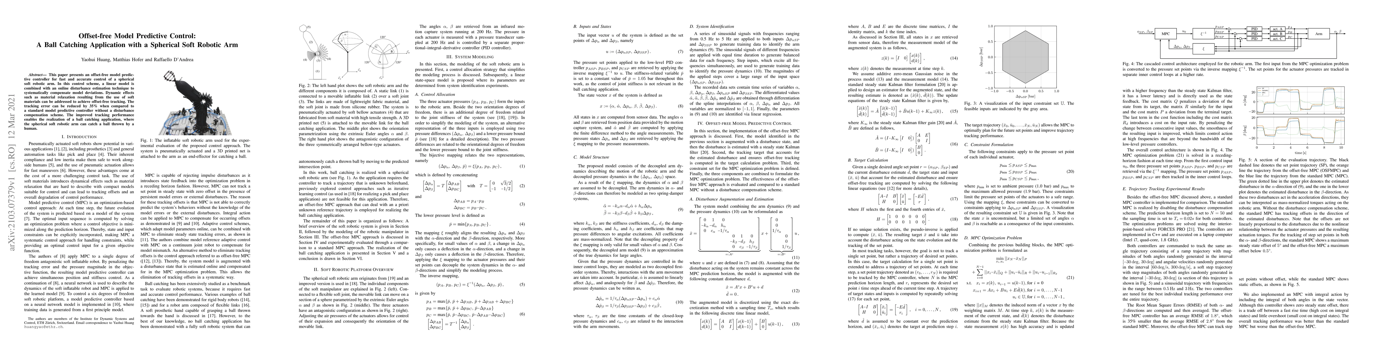 This paper introduces an offset-free model predictive controller for a spherical soft robotic arm, combining a linear model with an online disturbance estimation to compensate for model deviations. The approach achieves 35% better tracking performance compared to standard methods, enabling successful ball catching.