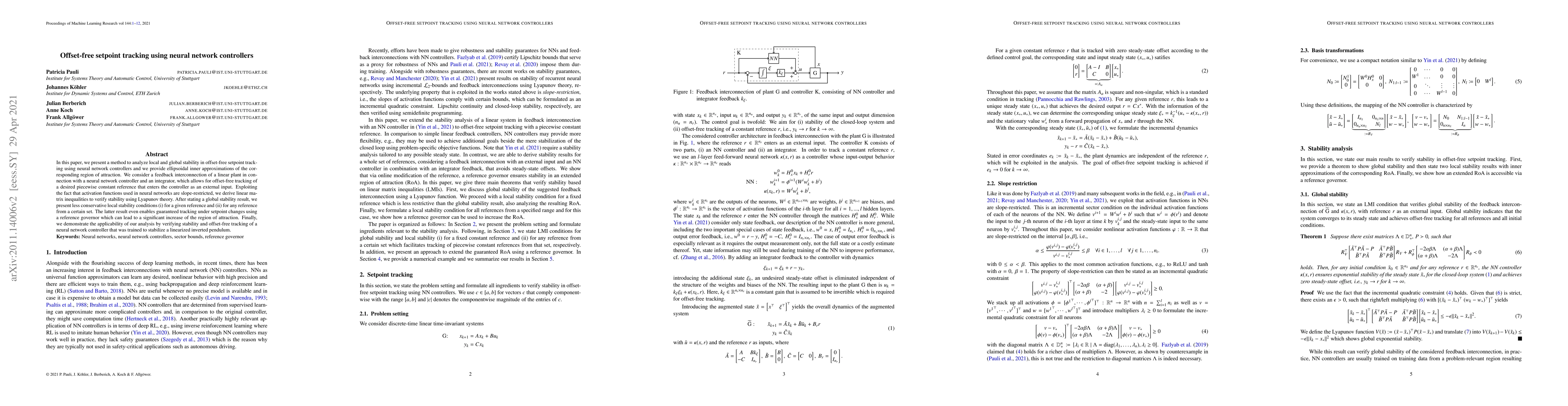 This paper proposes a method for offset-free setpoint tracking using neural network controllers, ensuring stability through ellipsoidal approximations and linear matrix inequalities derived from Lyapunov theory. It demonstrates the approach's effectiveness in stabilizing a linearized inverted pendulum.