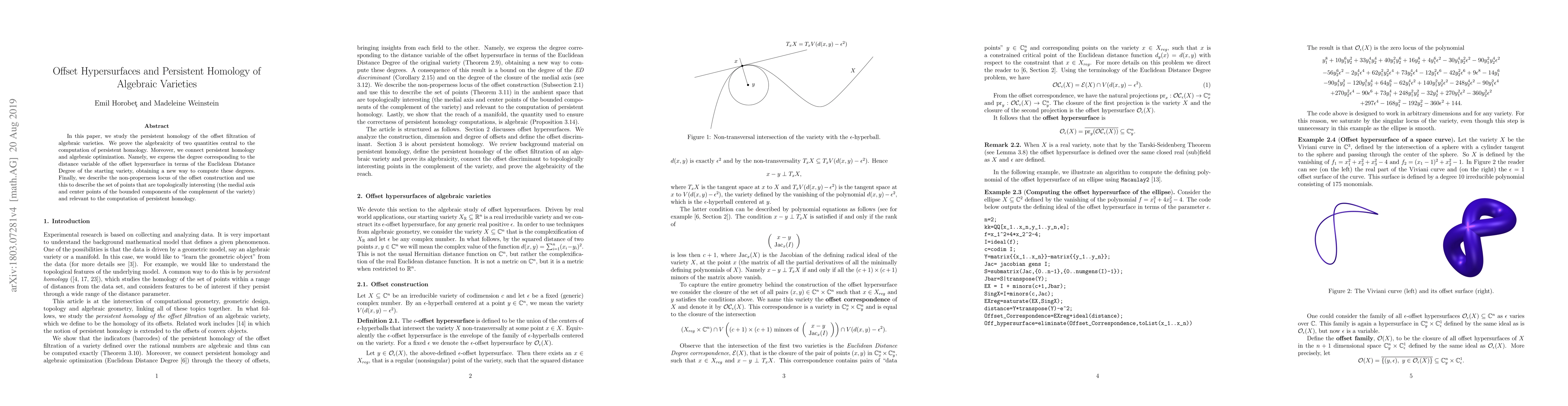 In this paper, we study the persistent homology of the offset filtration of algebraic varieties. We prove the algebraicity of two quantities central to the computation of persistent homology. Moreover, we connect persistent homology and algebraic optimization. Namely, we express the degree corresponding to the distance variable of the offset hypersurface in terms of the Euclidean Distance Degree of the starting variety, obtaining a new way to compute these degrees. Finally, we describe the non-properness locus of the offset construction and use this to describe the set of points that are topologically interesting (the medial axis and center points of the bounded components of the complement of the variety) and relevant to the computation of persistent homology.