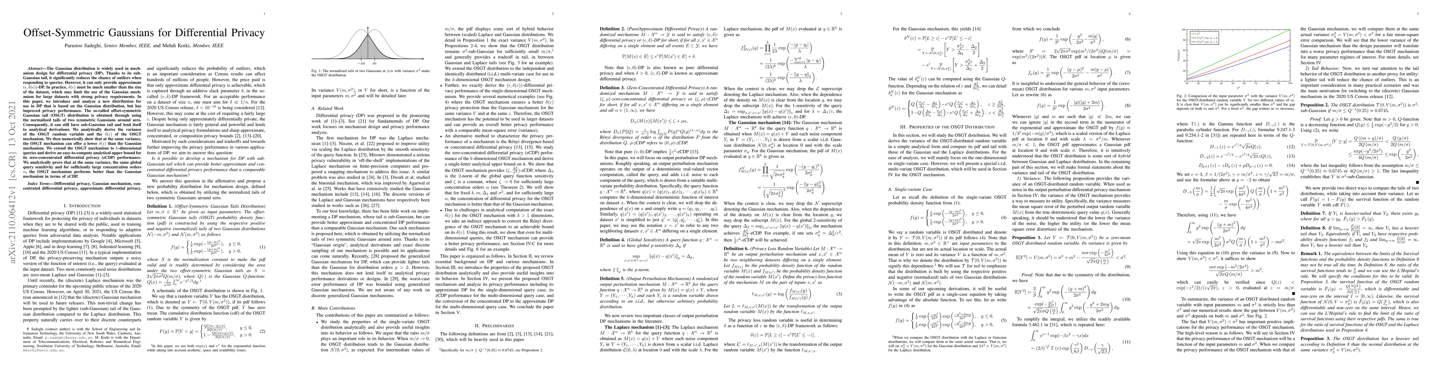 The Gaussian distribution is widely used in mechanism design for differential privacy (DP). Thanks to its sub-Gaussian tail, it significantly reduces the chance of outliers when responding to queries. However, it can only provide approximate $(\epsilon, \delta(\epsilon))$-DP. In practice, $\delta(\epsilon)$ must be much smaller than the size of the dataset, which may limit the use of the Gaussian mechanism for large datasets with strong privacy requirements. In this paper, we introduce and analyze a new distribution for use in DP that is based on the Gaussian distribution, but has improved privacy performance. The so-called offset-symmetric Gaussian tail (OSGT) distribution is obtained through using the normalized tails of two symmetric Gaussians around zero. Consequently, it can still have sub-Gaussian tail and lend itself to analytical derivations. We analytically derive the variance of the OSGT random variable and the $\delta(\epsilon)$ of the OSGT mechanism. We then numerically show that at the same variance, the OSGT mechanism can offer a lower $\delta(\epsilon)$ than the Gaussian mechanism. We extend the OSGT mechanism to $k$-dimensional queries and derive an easy-to-compute analytical upper bound for its zero-concentrated differential privacy (zCDP) performance. We analytically prove that at the same variance, the same global query sensitivity and for sufficiently large concentration orders $\alpha$, the OSGT mechanism performs better than the Gaussian mechanism in terms of zCDP.