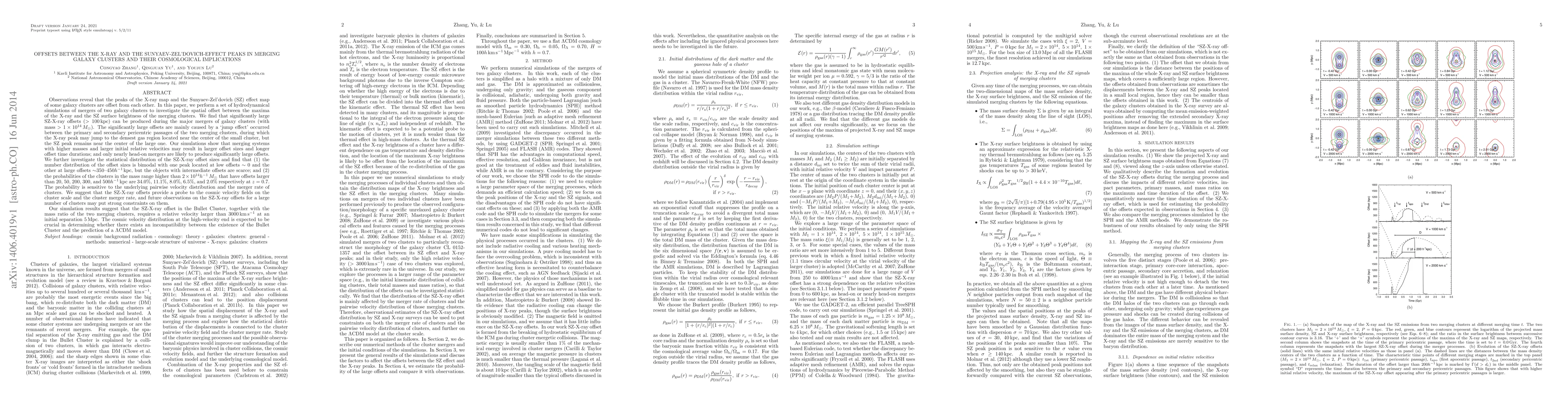 This paper investigates the spatial offsets between X-ray and Sunyaev-Zel'dovich (SZ) effect peaks in merging galaxy clusters through hydrodynamical simulations. It finds that major mergers can produce large SZ-X-ray offsets (>100kpc) due to a 'jump effect' during pericentric passages, with higher mass and velocity mergers resulting in larger offsets. The study concludes that future observations of these offsets could provide insights into cosmic velocity fields and cluster merger rates.