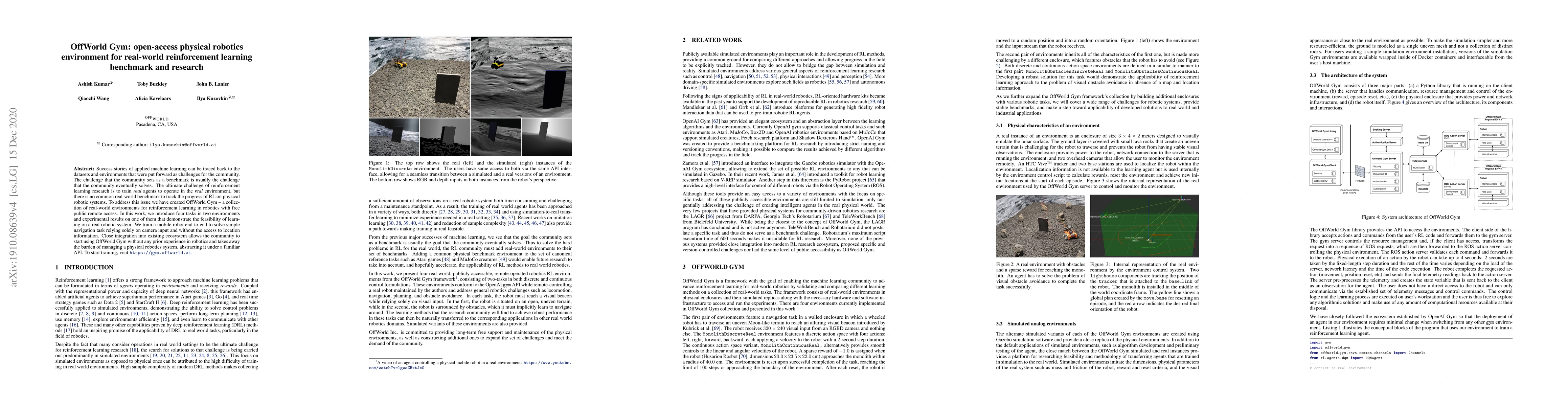 The paper introduces OffWorld Gym, a real-world robotics environment for reinforcement learning accessible remotely, aiming to provide a benchmark for real-world RL tasks. It presents a navigation task and baseline results, facilitating community engagement without requiring robotics expertise.