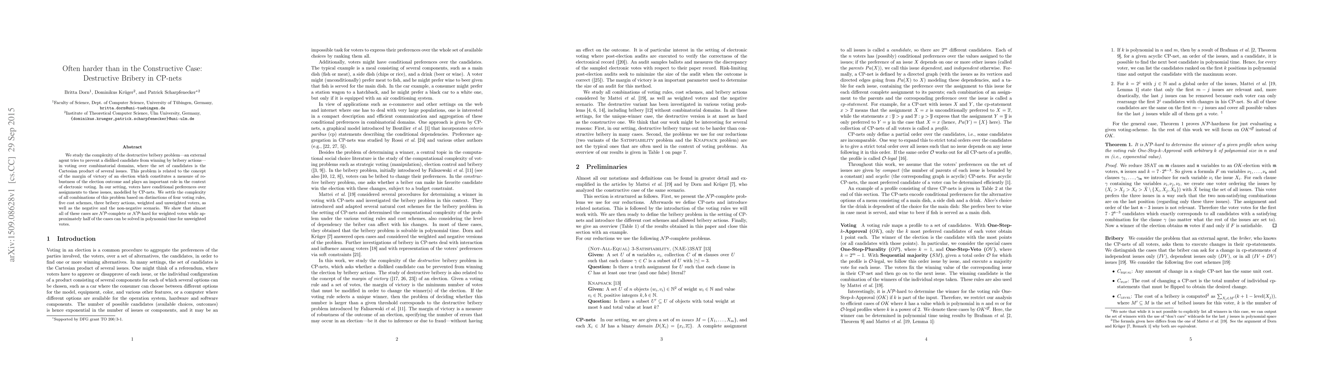 Researchers studied the complexity of bribery in voting systems with conditional preferences, finding that most cases are NP-complete or NP-hard for weighted votes, but some can be solved quickly for unweighted votes.