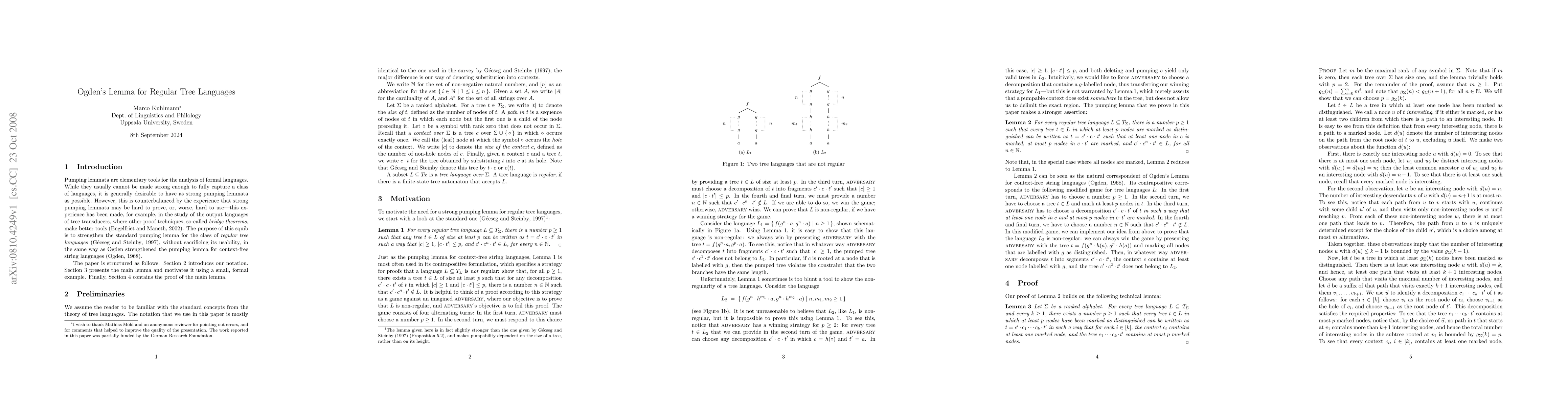 Summary: Ogden's Lemma for Regular Tree Languages presents a strong pumping lemma for regular tree languages, analogous to Ogden's lemma for context-free string languages, providing a foundational tool for analyzing these tree structures.