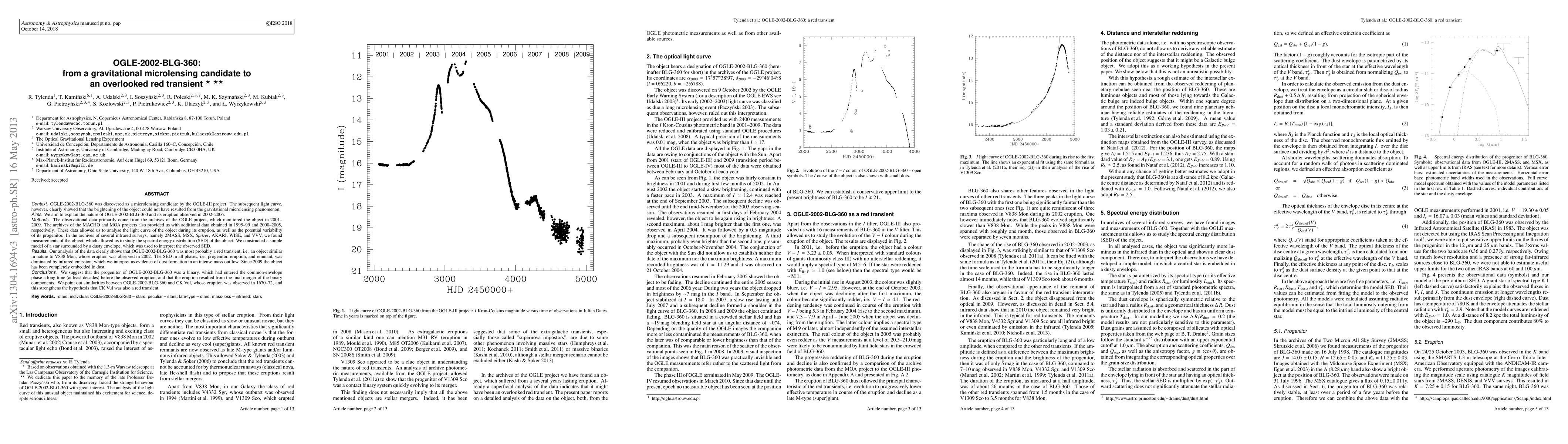 The research paper identifies OGLE-2002-BLG-360 as a red transient, akin to V838 Mon, with its eruption in 2002. The study utilized data from various projects and infrared surveys to analyze the light curve, progenitor variability, and spectral energy distribution (SED). The SED indicated dust formation due to a mass outflow, suggesting the progenitor was a binary that underwent a merger, causing the eruption. The paper also draws parallels with CK Vul's 1670-72 eruption, proposing it too was a red transient.